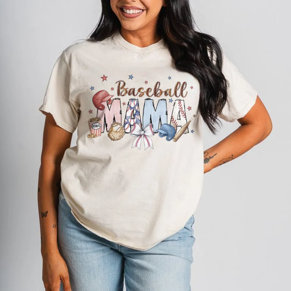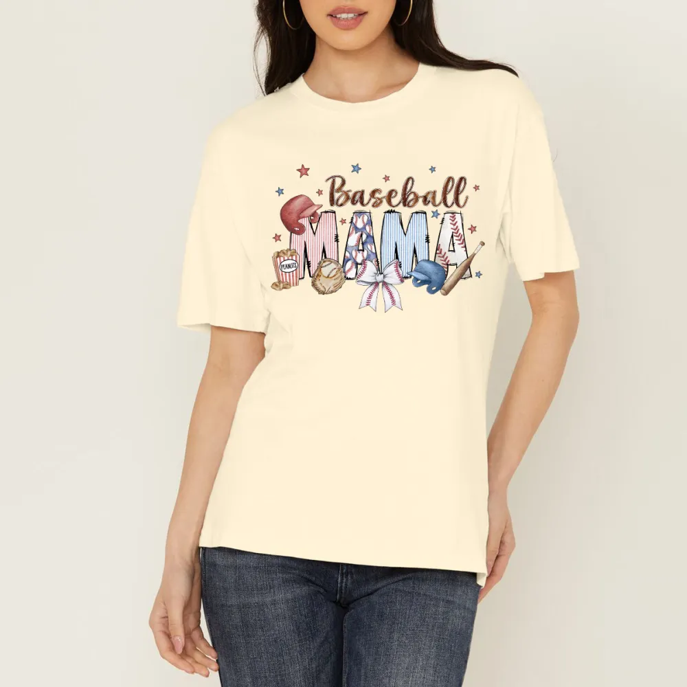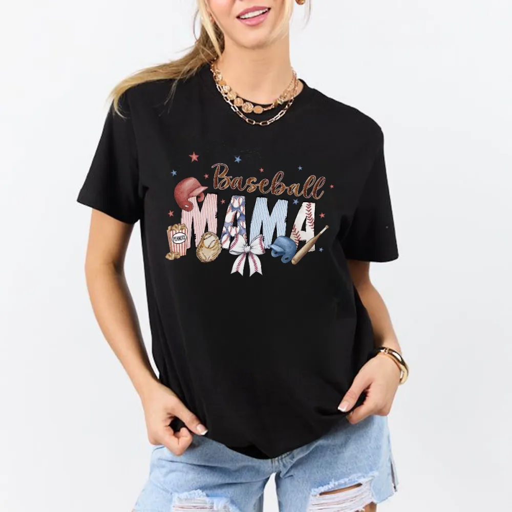 "Baseball Mama", Slogan And Baseball, Baseball Glove, Baseball Bat, Bow, And Star-Studded Combination Pattern, Simple, Casual T-Shirt.