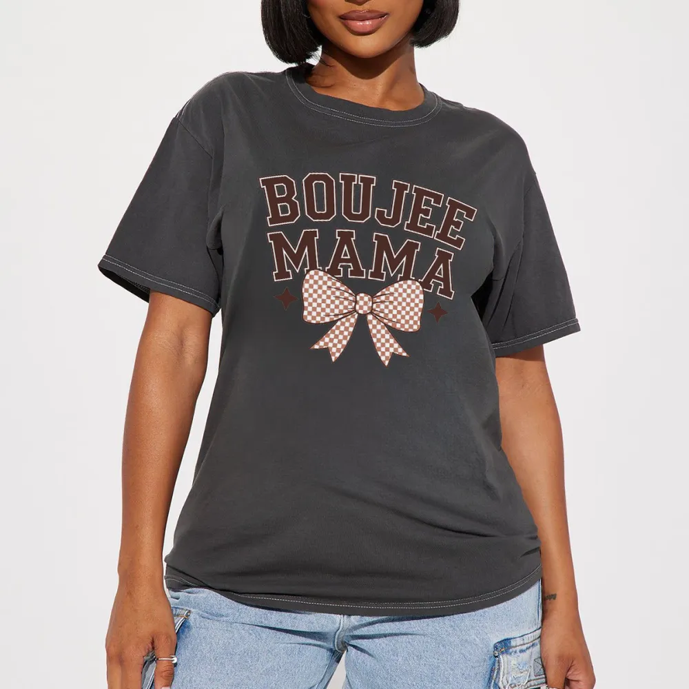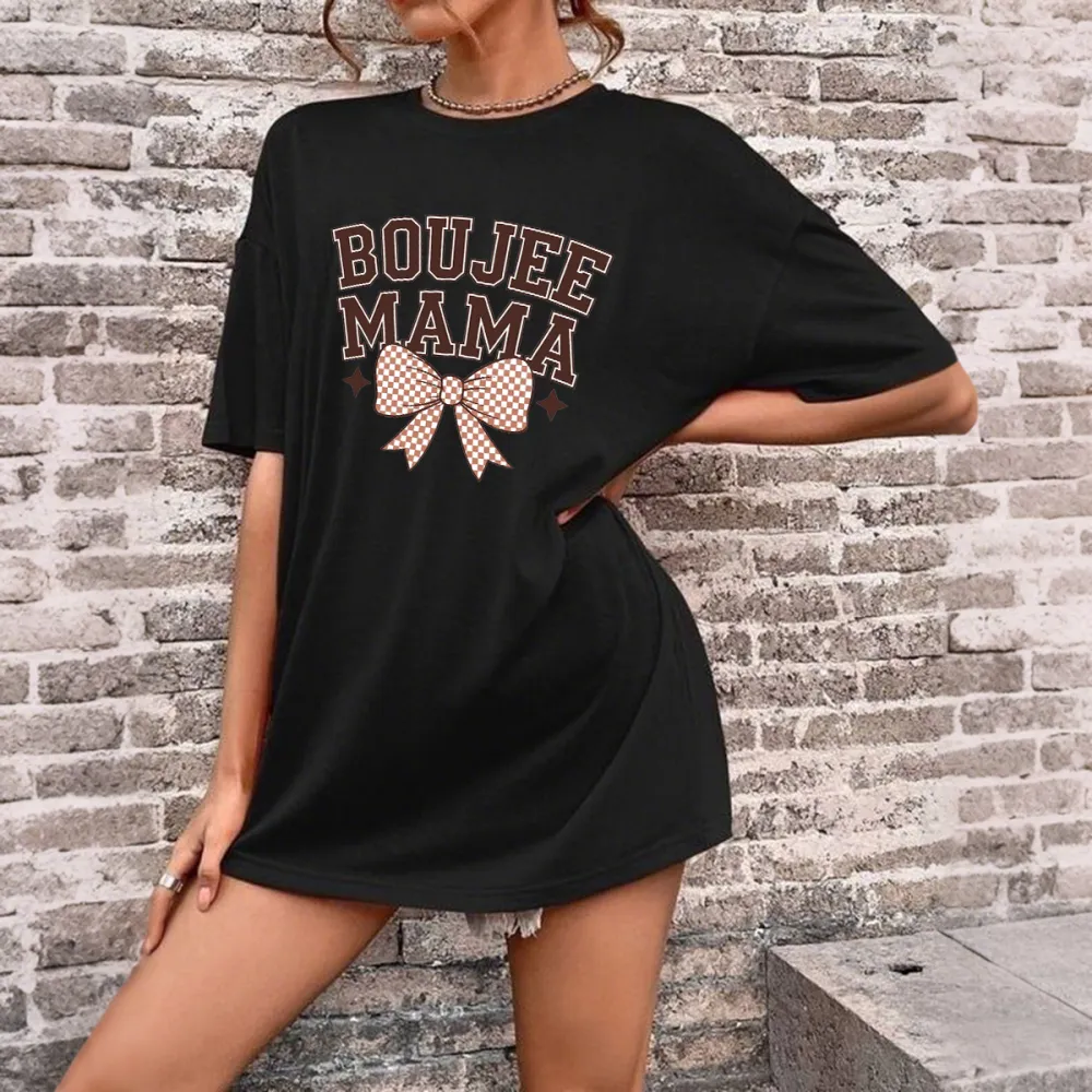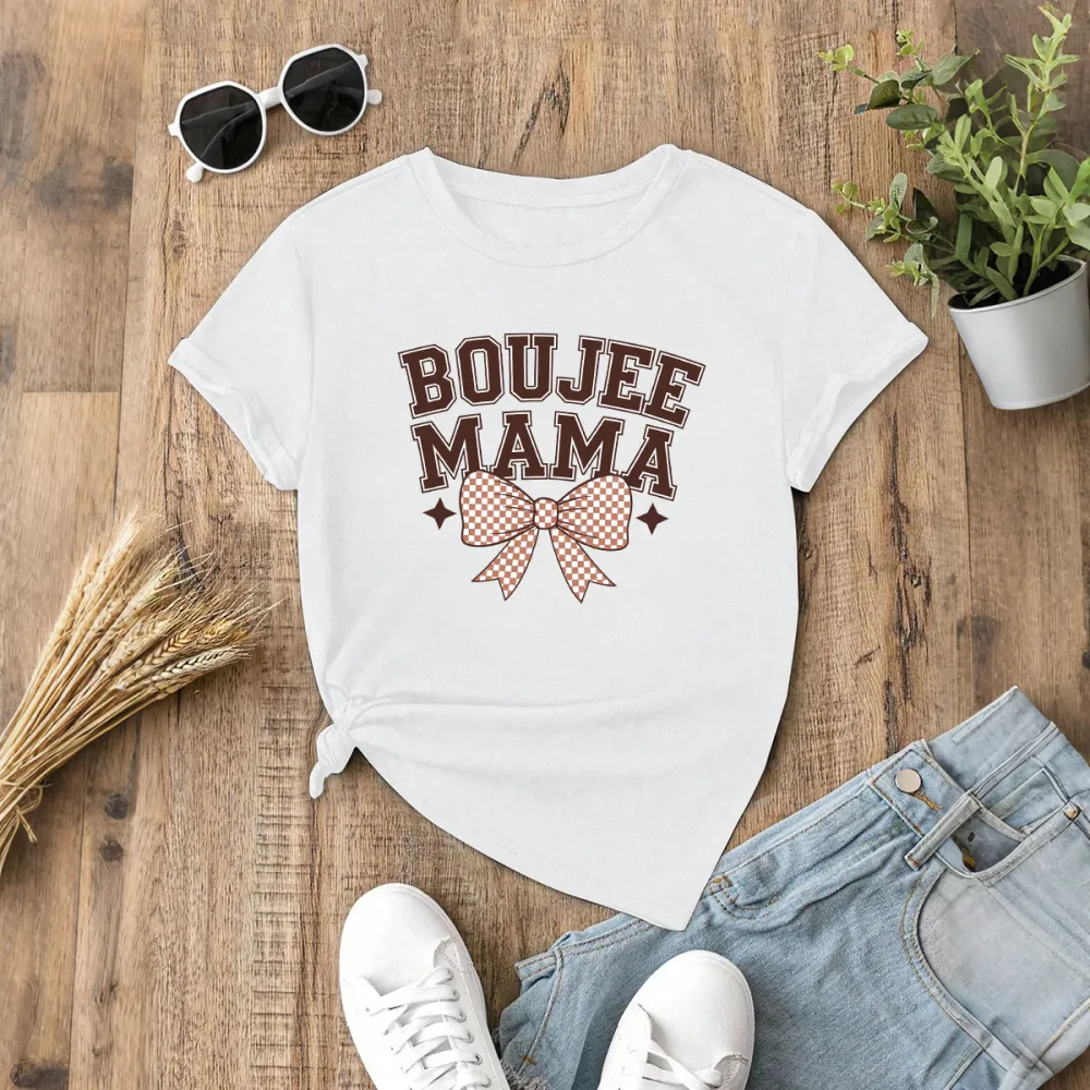 "Boujee Mama", Slogan And A Checkered Pattern Of Bows And Stars, Casual T-Shirt. 2026826