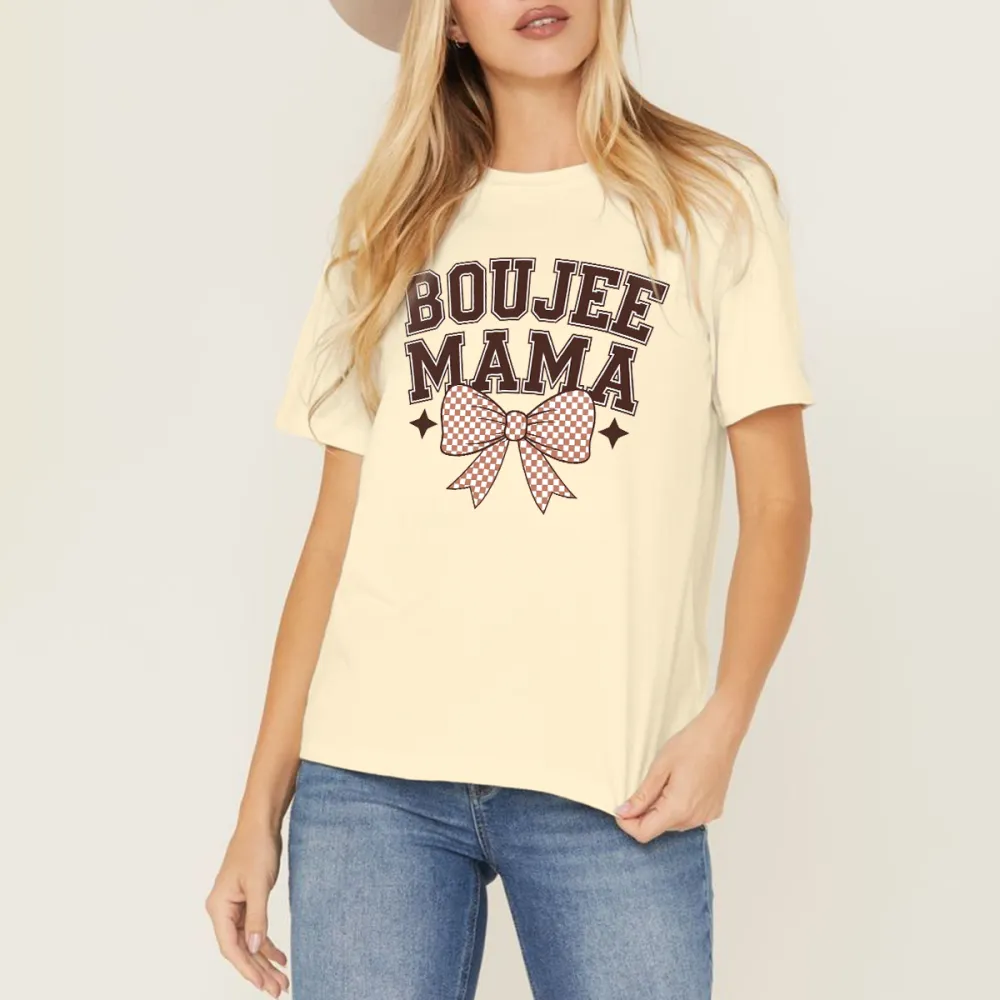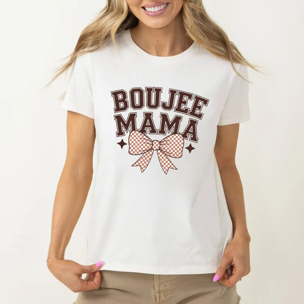 "Boujee Mama", Slogan And A Checkered Pattern Of Bows And Stars, Casual T-Shirt.