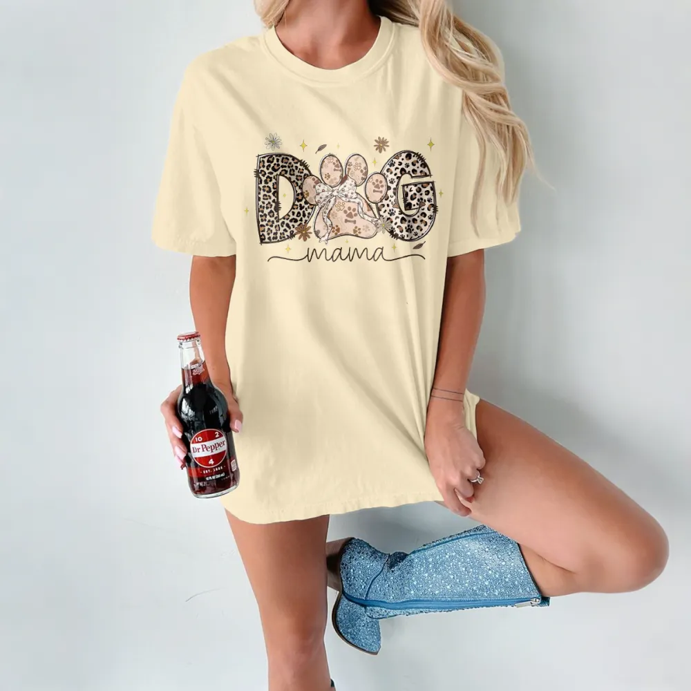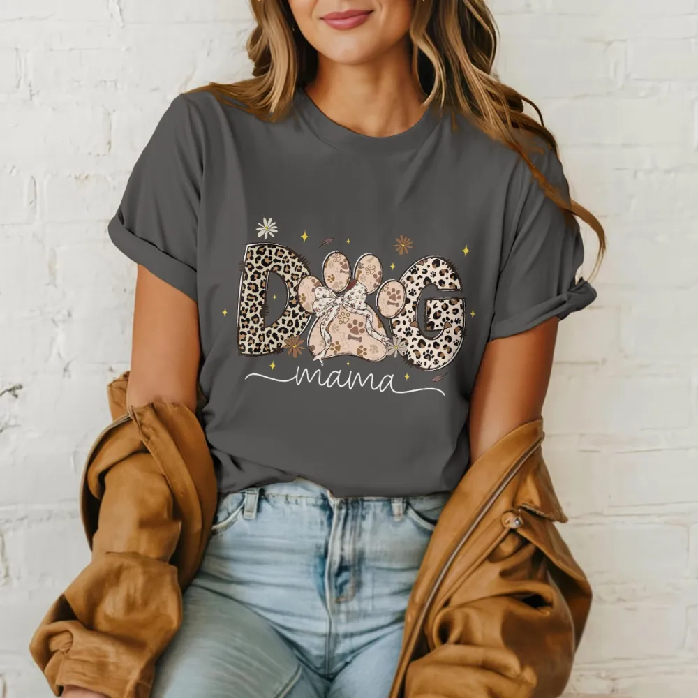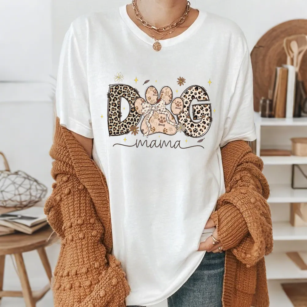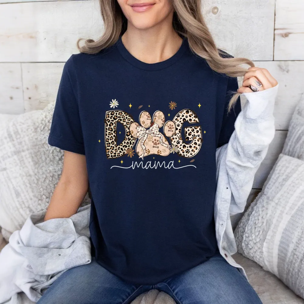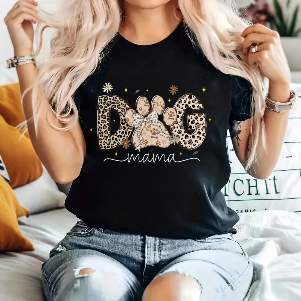 "Dog Mama", "O" Is Designed As A Dog Paw Print, "D" And "G" Are Decorated With Leopard Prints And Stars And Flowers. The Overall Style Is Fashionable And Casual T-Shirt.
