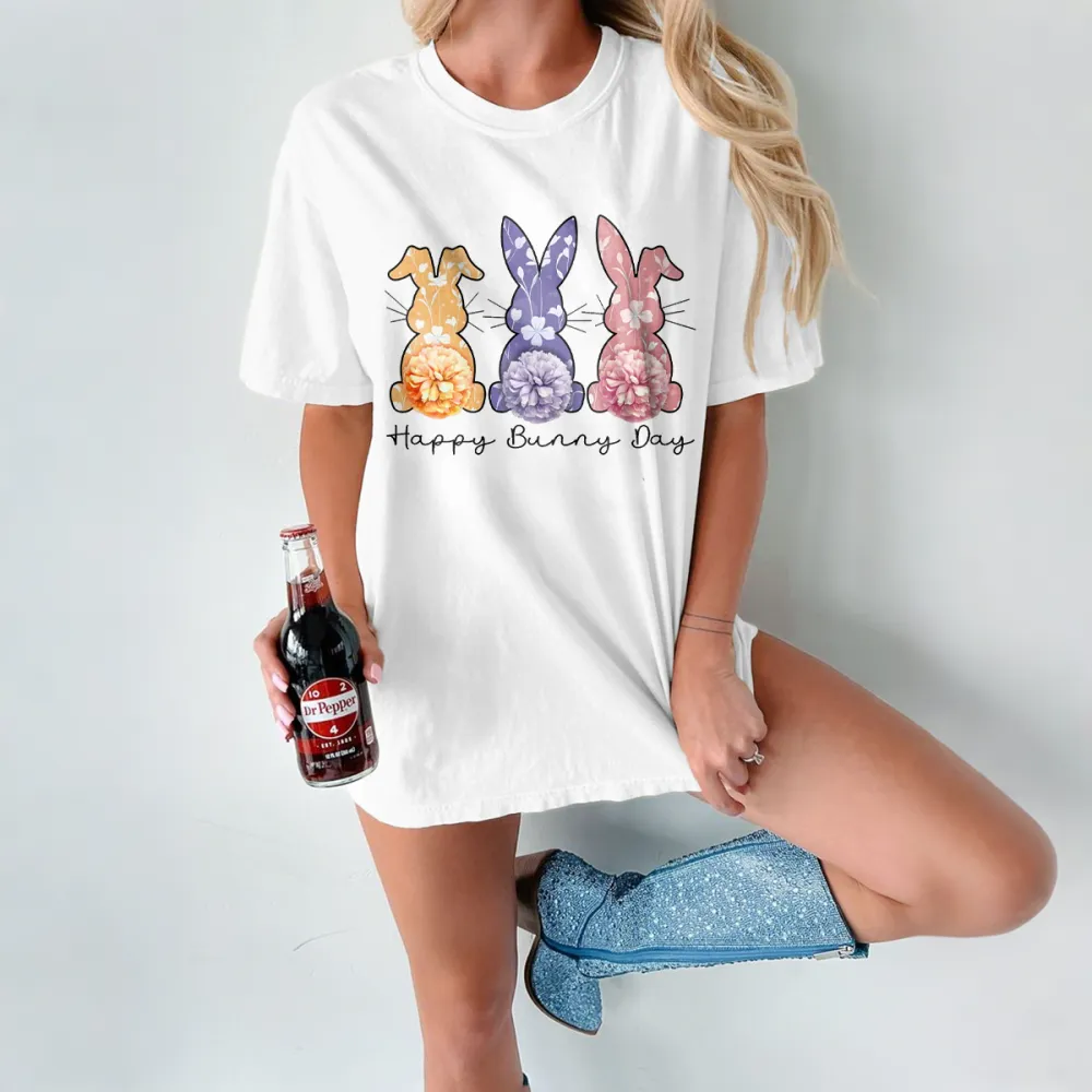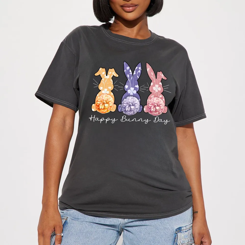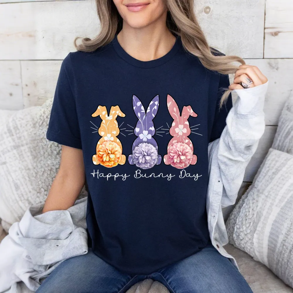 "Happy Bunny Day", Slogan And Three Rabbits With Different Colors, The Rabbits Are Decorated With Flower Patterns, Casual T-Shirt. 2024086