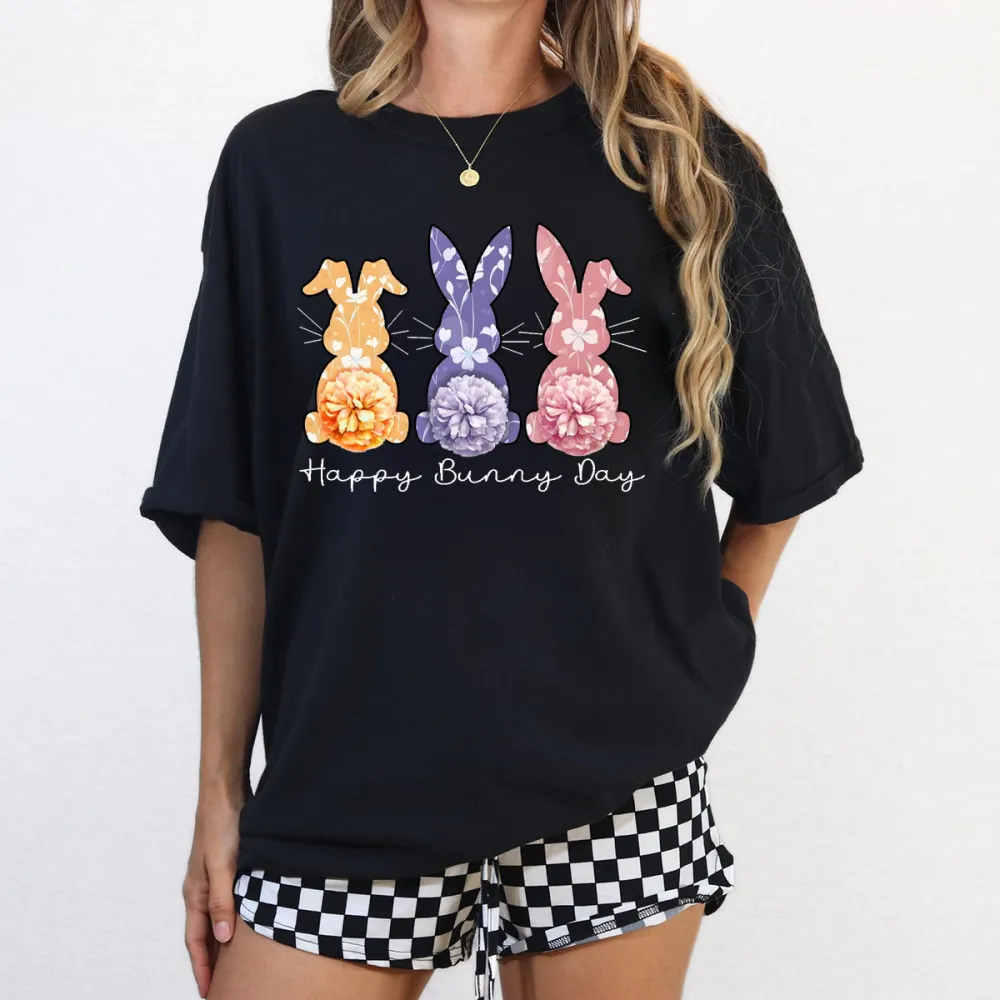 "Happy Bunny Day", Slogan And Three Rabbits With Different Colors, The Rabbits Are Decorated With Flower Patterns, Casual T-Shirt.
