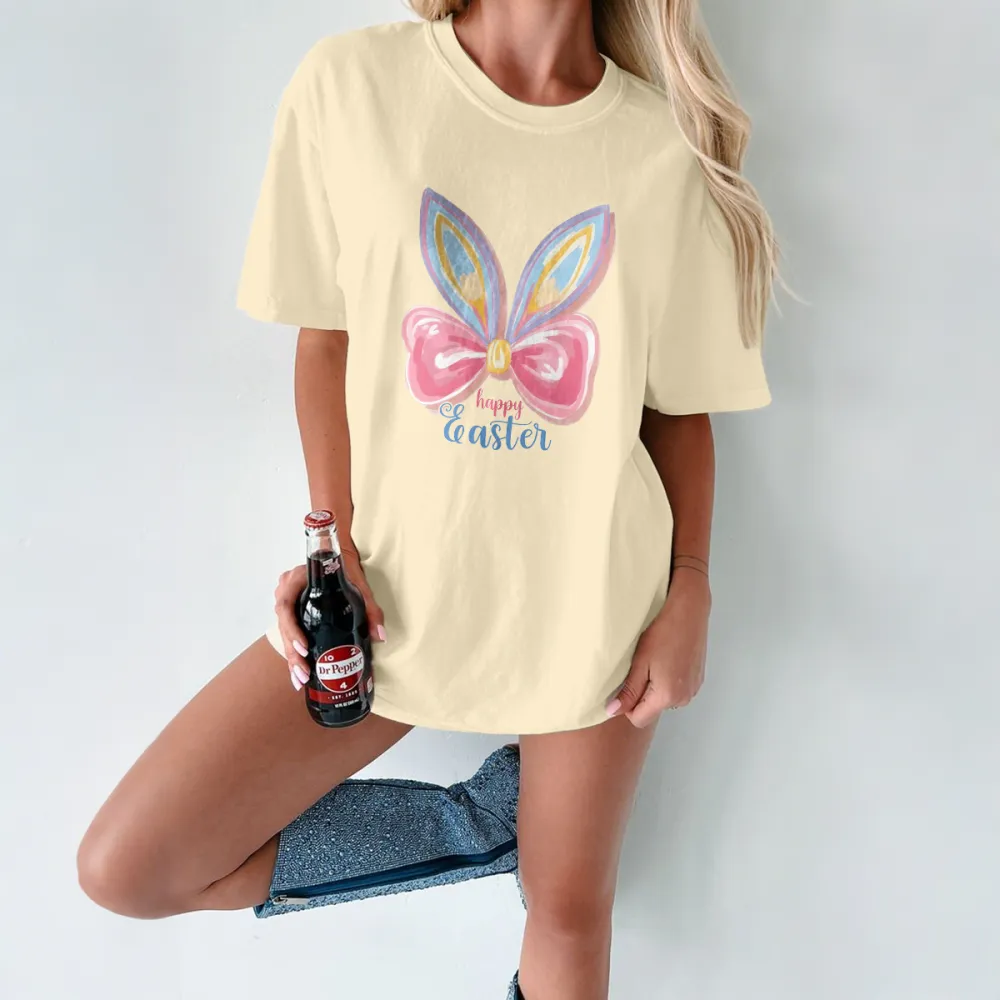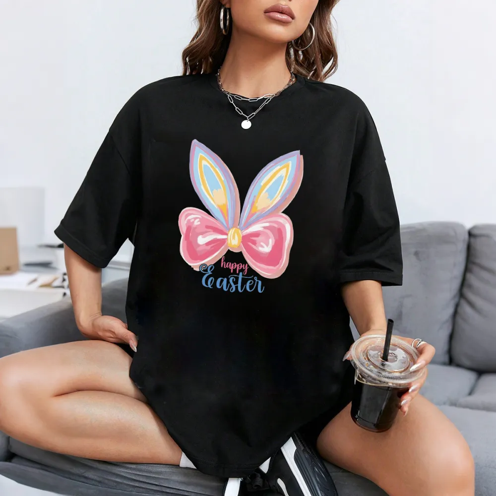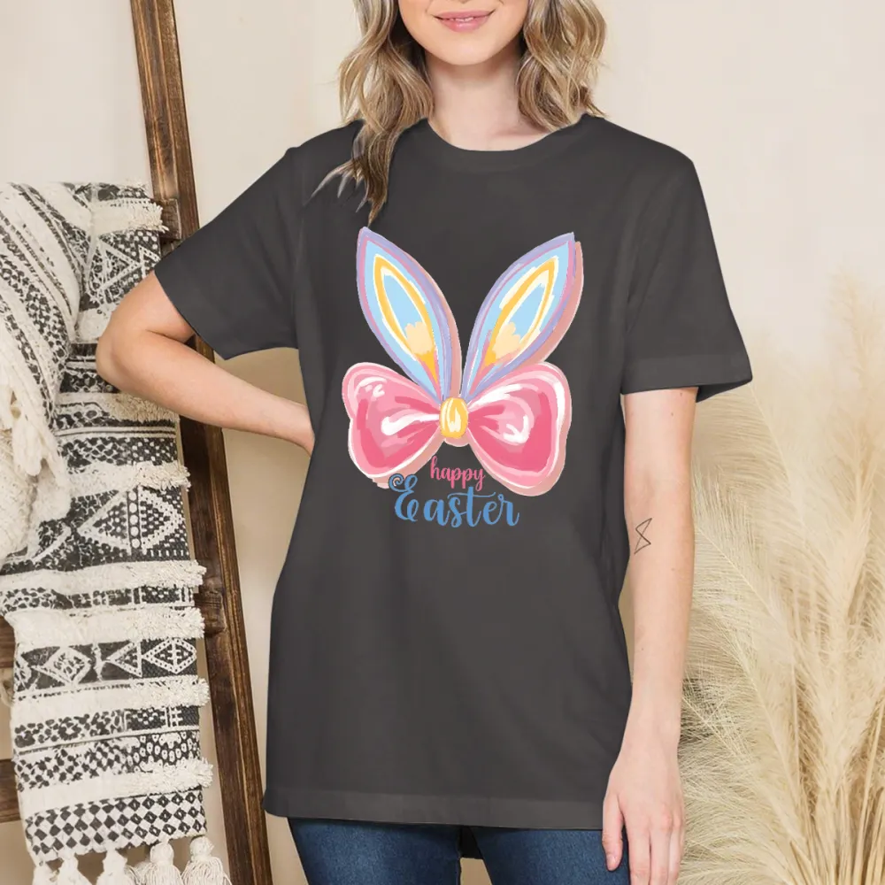 "Happy Easter", Slogan And Colorful Bunny Ears And Pink Bow Pattern, Casual T-Shirt.