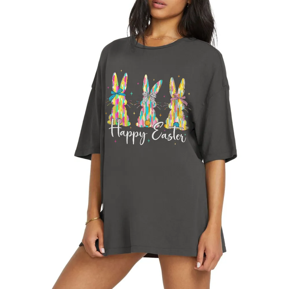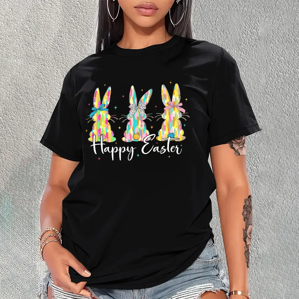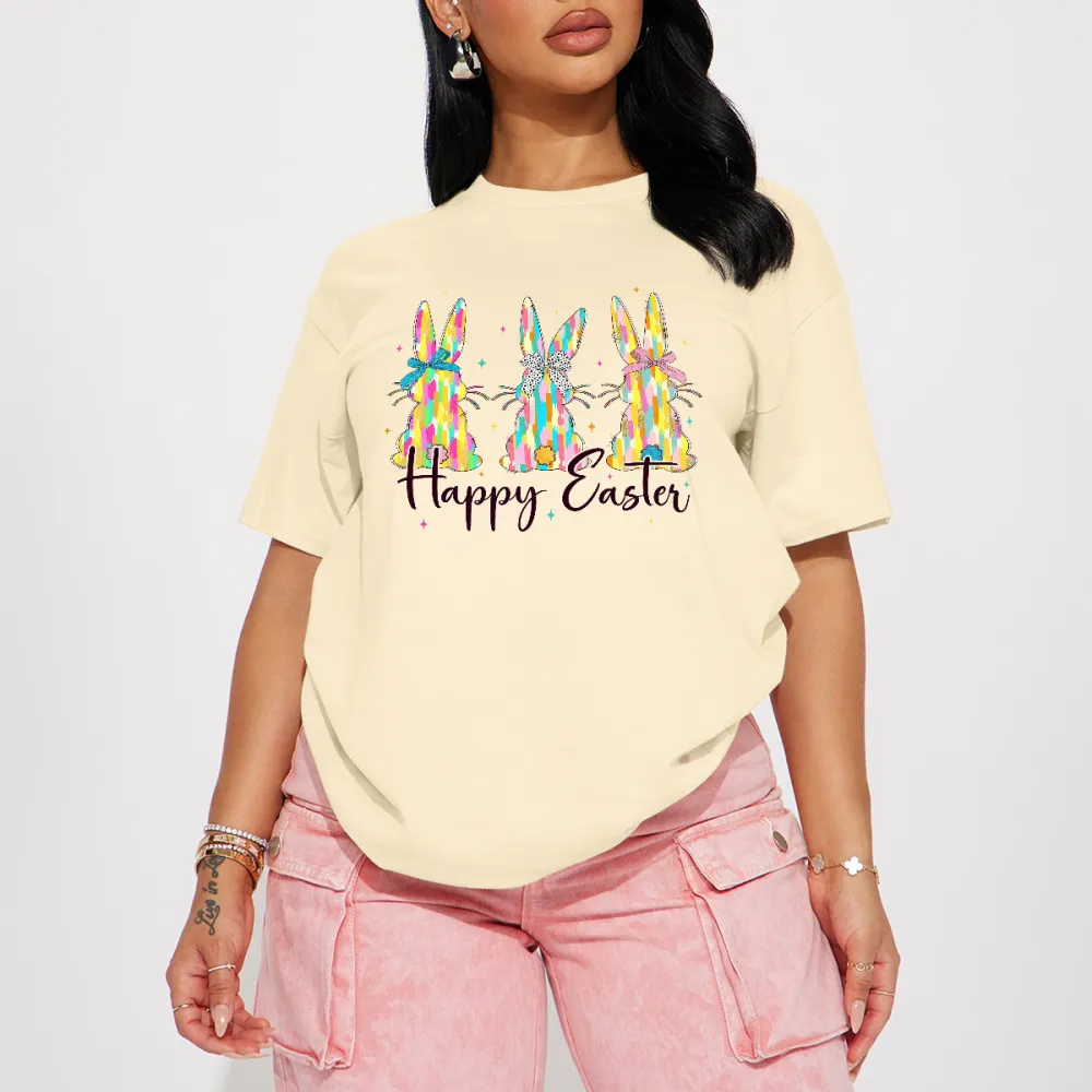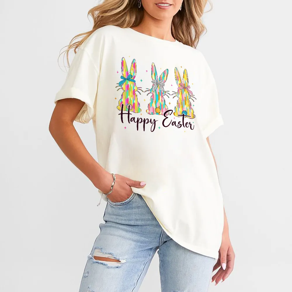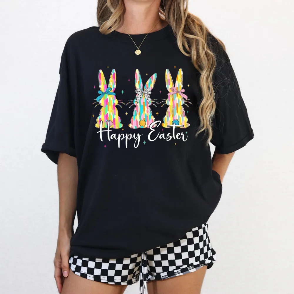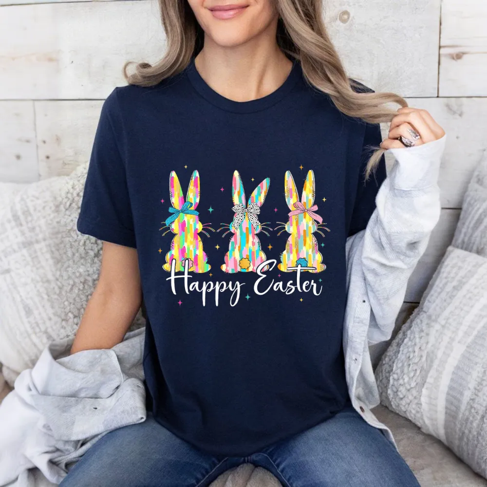 "Happy Easter" Slogan And Three Colorful Bunnies Graphic On Casual T-Shirt.