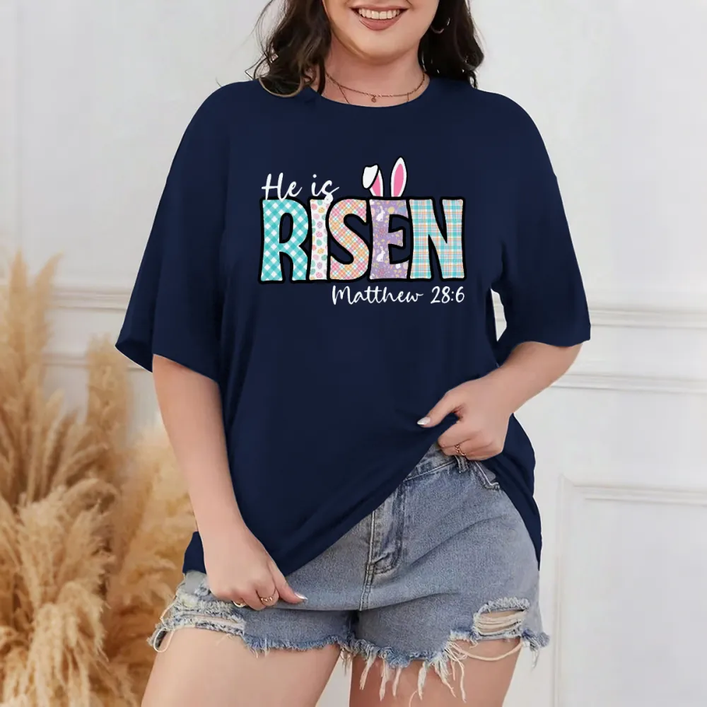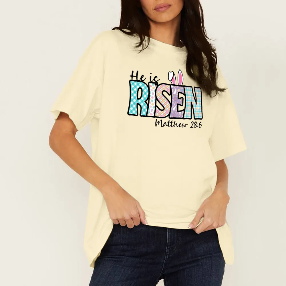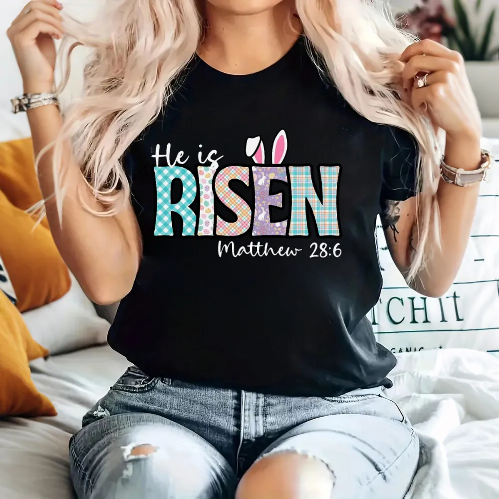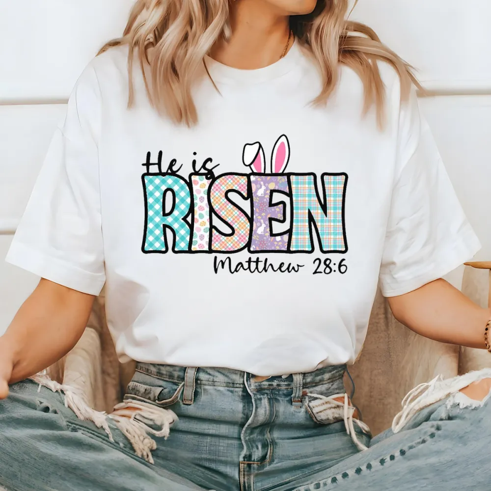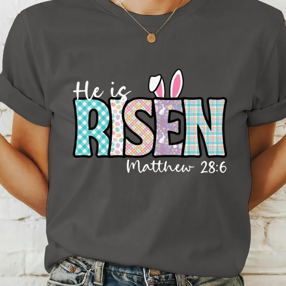 "He Is Risen", "Matthew 28:6", The Letters In The Pattern Use A Variety Of Plaid Patterns And Rabbit Ears Elements, Casual T-Shirt. 2022352