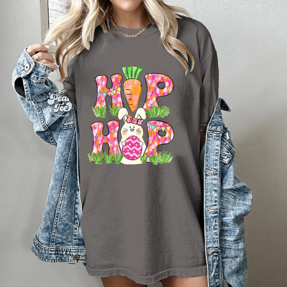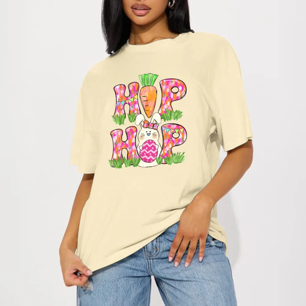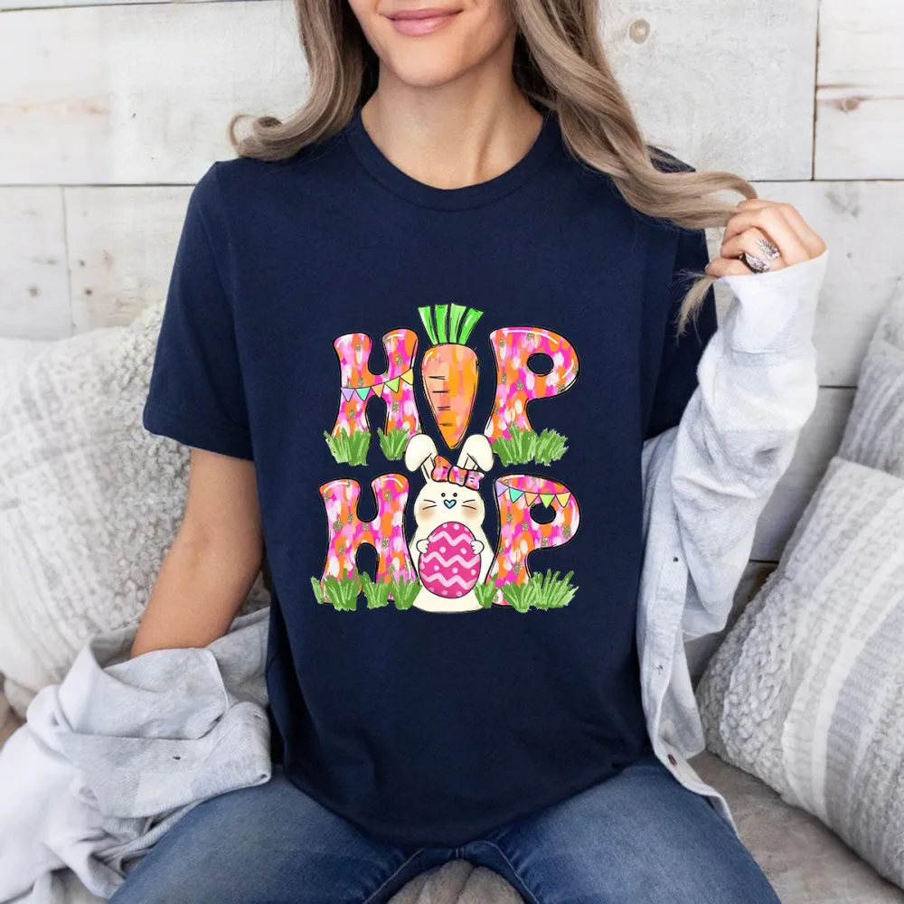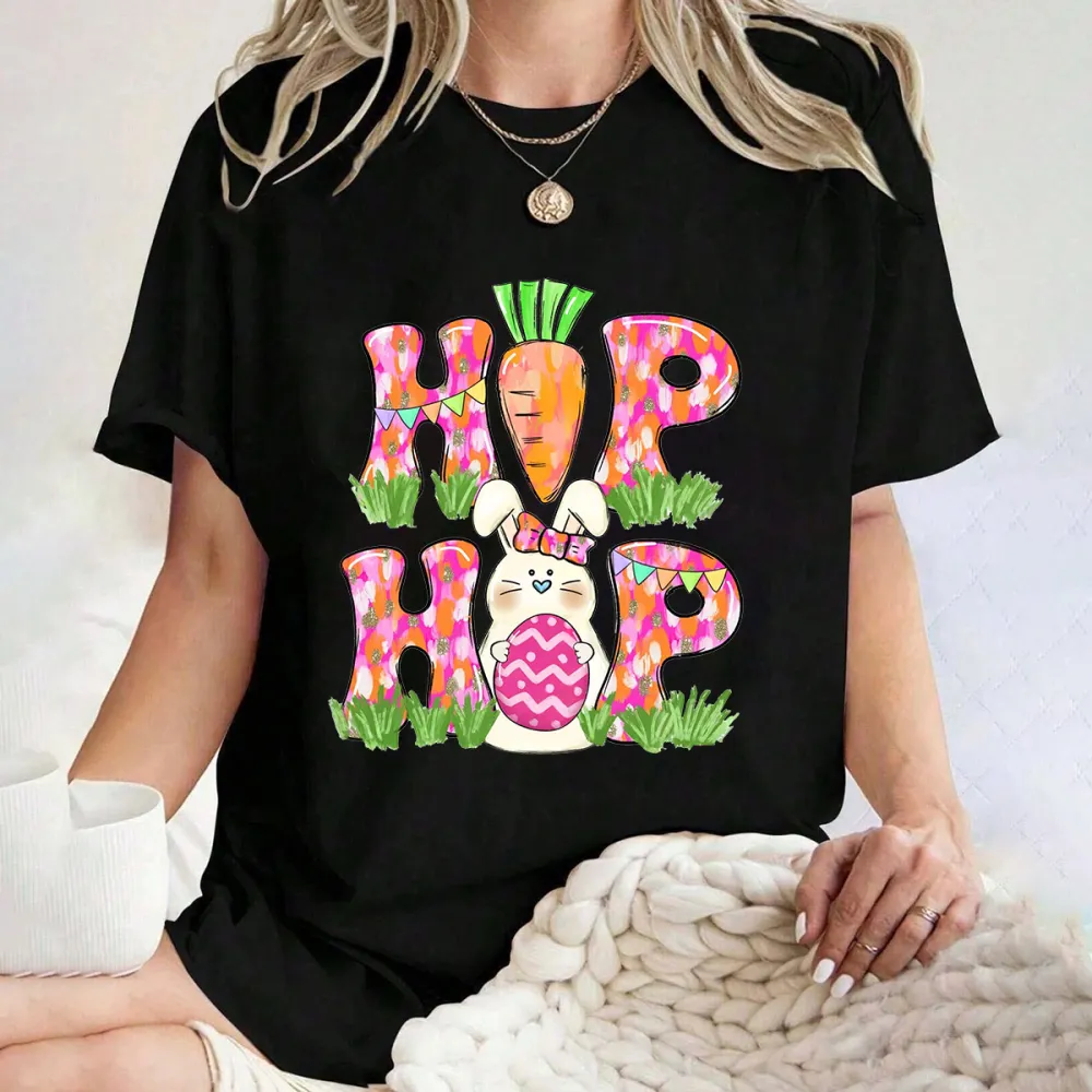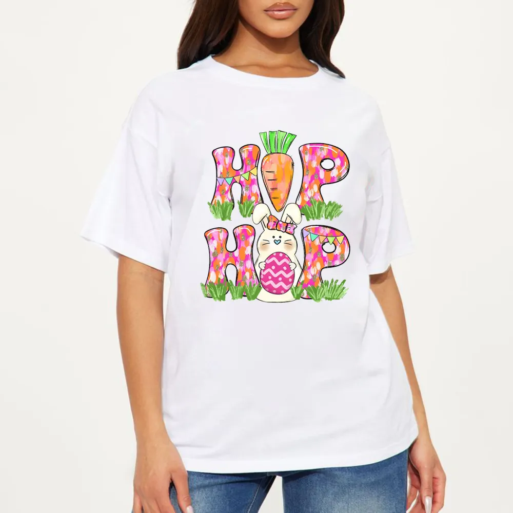 "Hop" Is Designed In A Colorful And Geometric Style, "O" Is A Rabbit Holding An Egg And A Carrot, Surrounded By Green Grass Patterns, Casual T-Shirts.