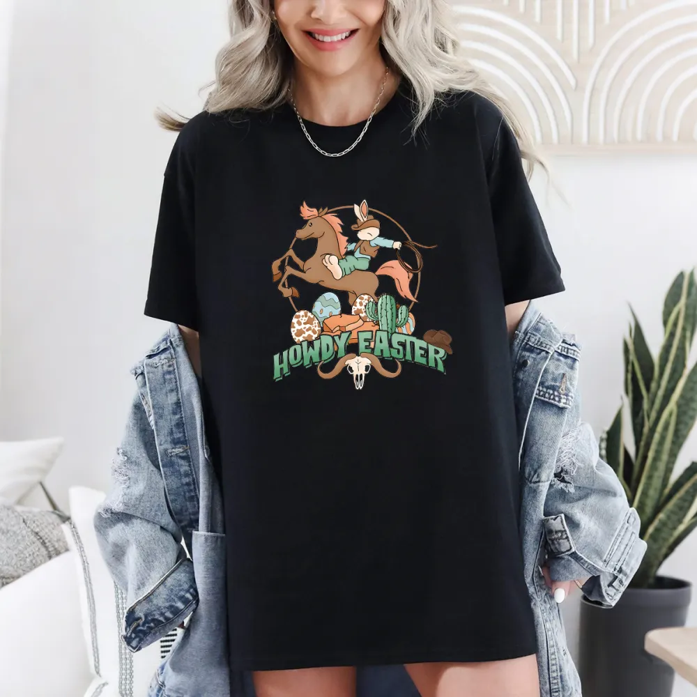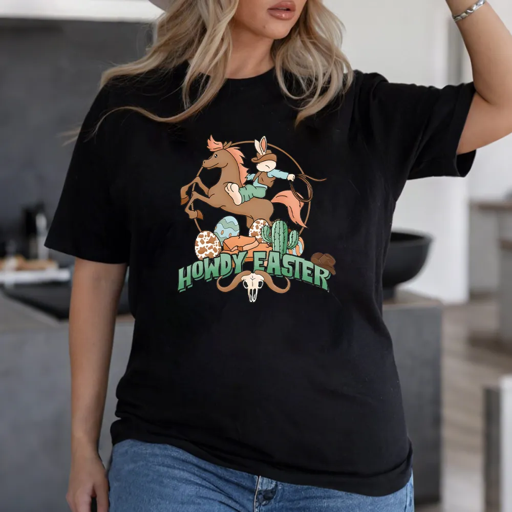 "Howdy Easter" Slogan And A Bunny Cowboy Riding A Brown Horse, Surrounded By Cacti, Easter Eggs And A Bull Skull Western Cowboy Pattern, Loose T-Shirt.