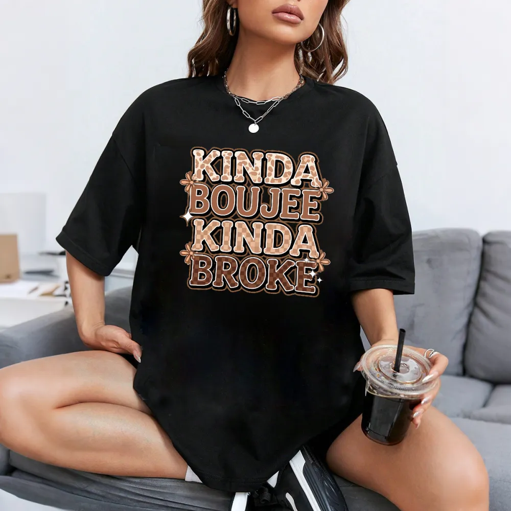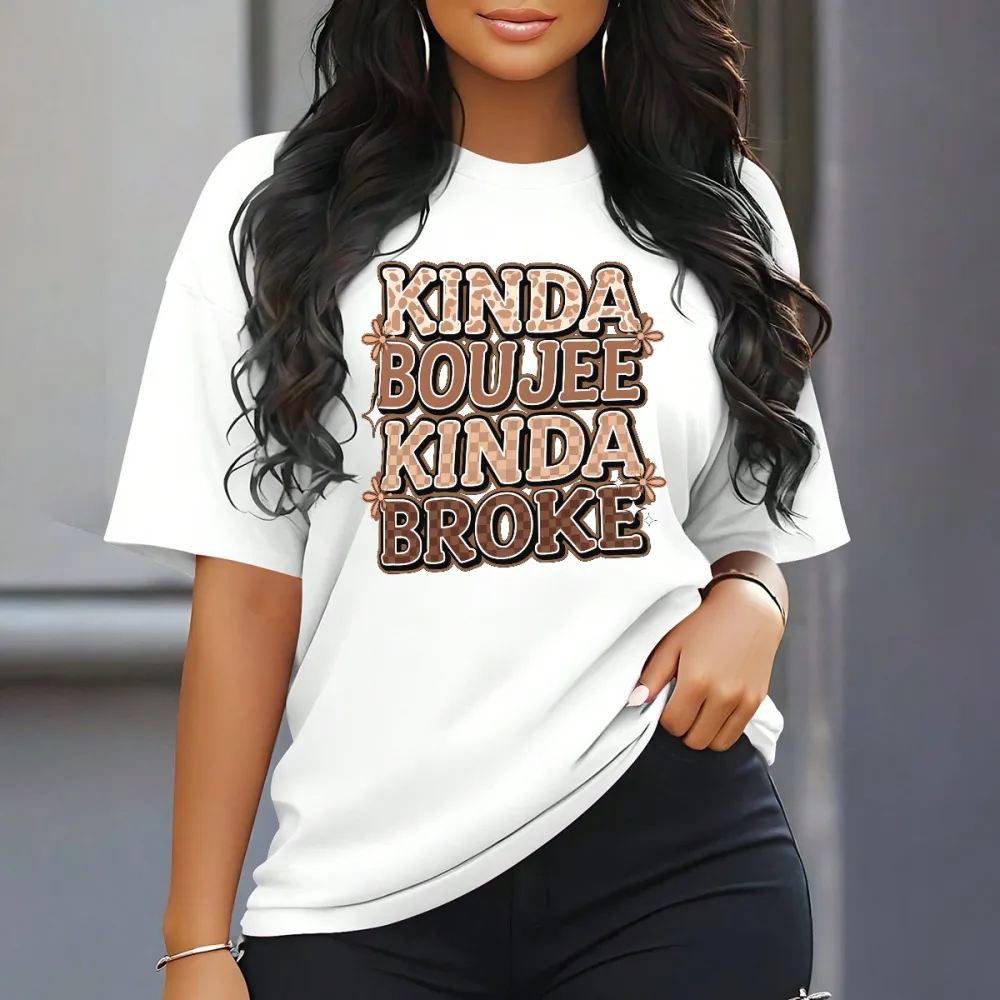 "Kinda Boujee Kinda Broke" Slogan Pattern With Leopard Print, Brown Plaid And Other Elements, Casual T-Shirt.