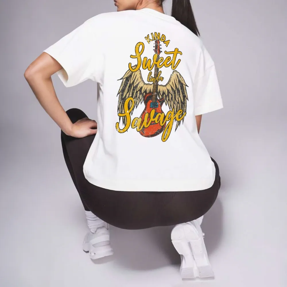 "Kinda Sweet Kinda Savage", Guitar And Wing Patterns, The Overall Style Shows A Personality That Is Both Sweet And Unruly, Fashionable And Casual Loose T-Shirt. 2030323