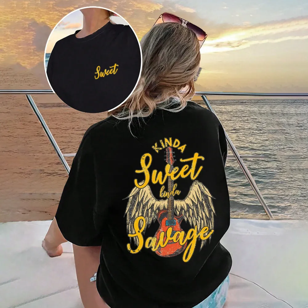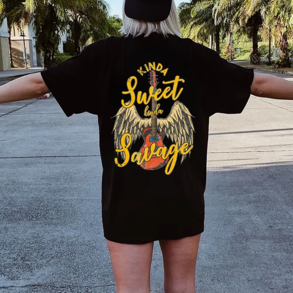 "Kinda Sweet Kinda Savage", Guitar And Wing Patterns, The Overall Style Shows A Personality That Is Both Sweet And Unruly, Fashionable And Casual Loose T-Shirt.