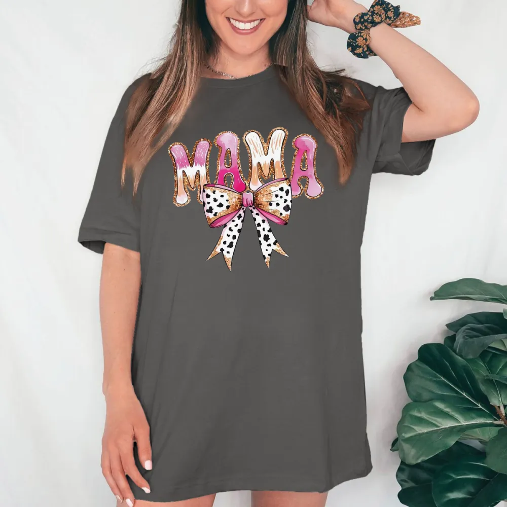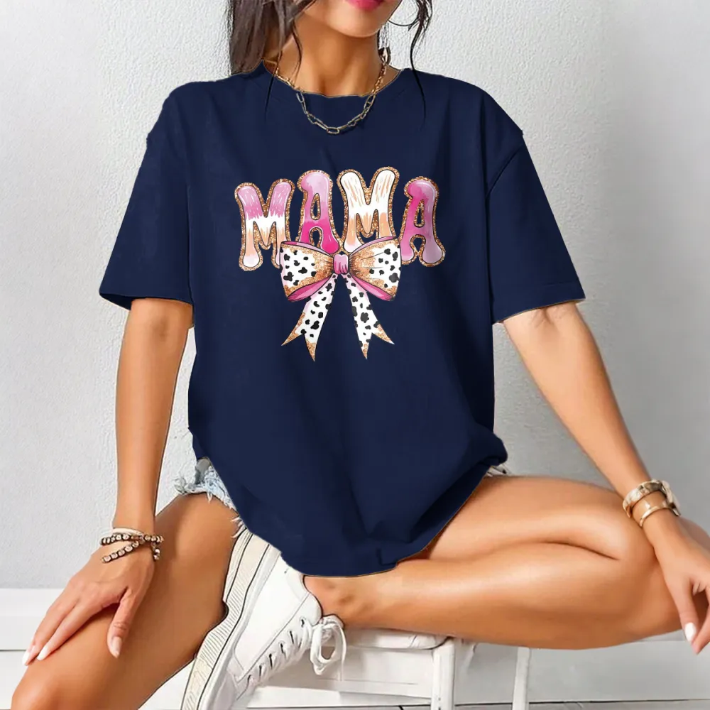 "Mama", Colorful Letters, Pink, Gold Gradient Effect And Leopard Print, Pink Bow Pattern, Casual T-Shirt