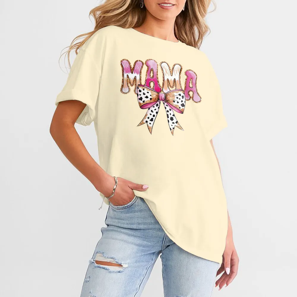 "Mama", Colorful Letters, Pink, Gold Gradient Effect And Leopard Print, Pink Bow Pattern, Casual T-Shirt 2025554