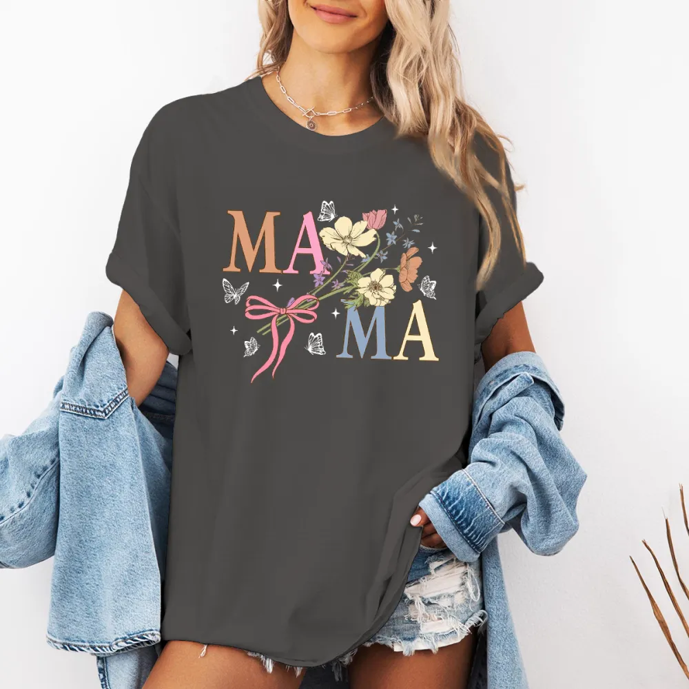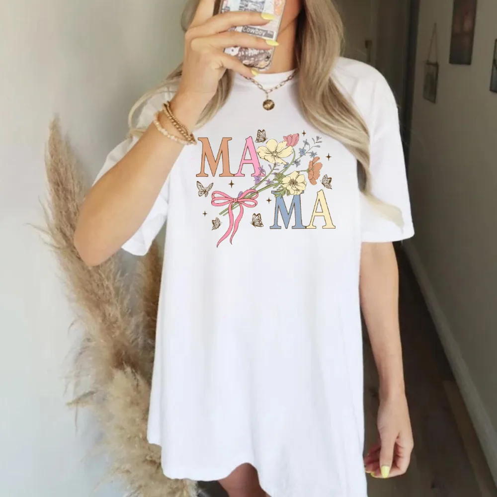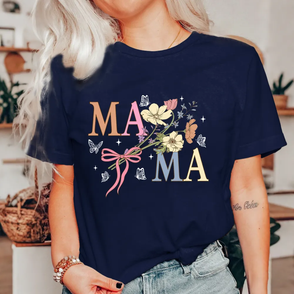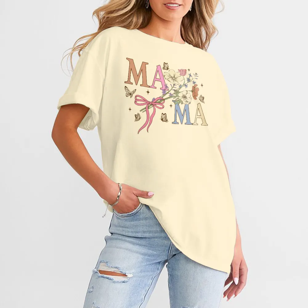 "Mama", Letters In Various Colors, A Bouquet Of Flowers Tied With A Pink Ribbon And Decorated With Butterflies And Small Stars, A Casual T-Shirt.