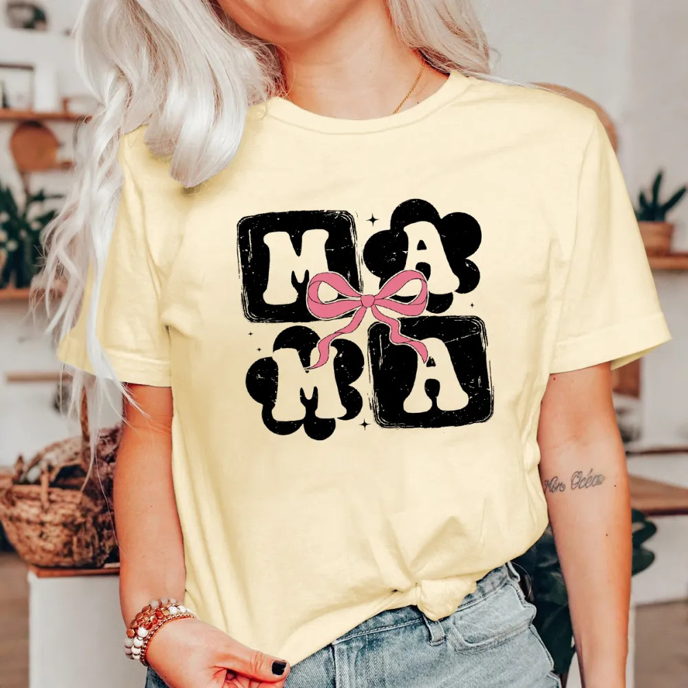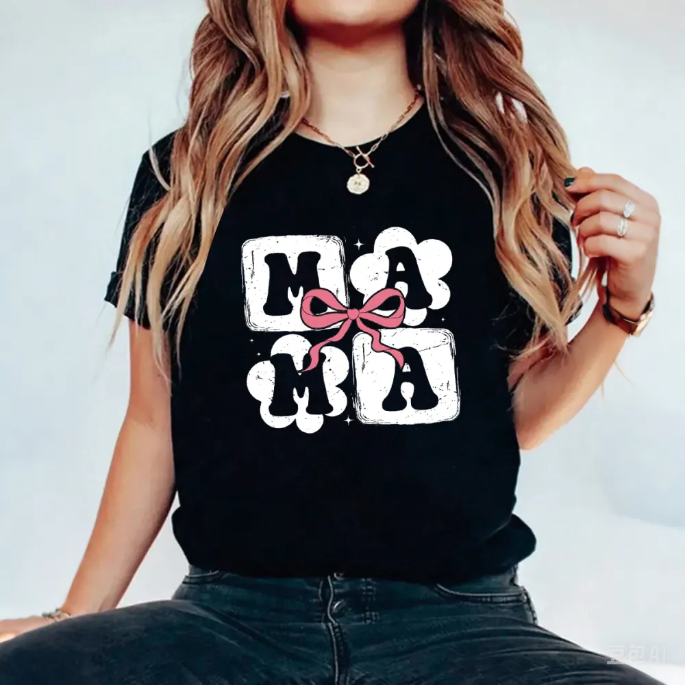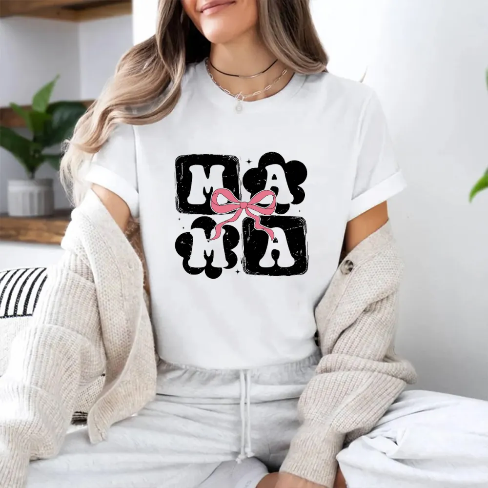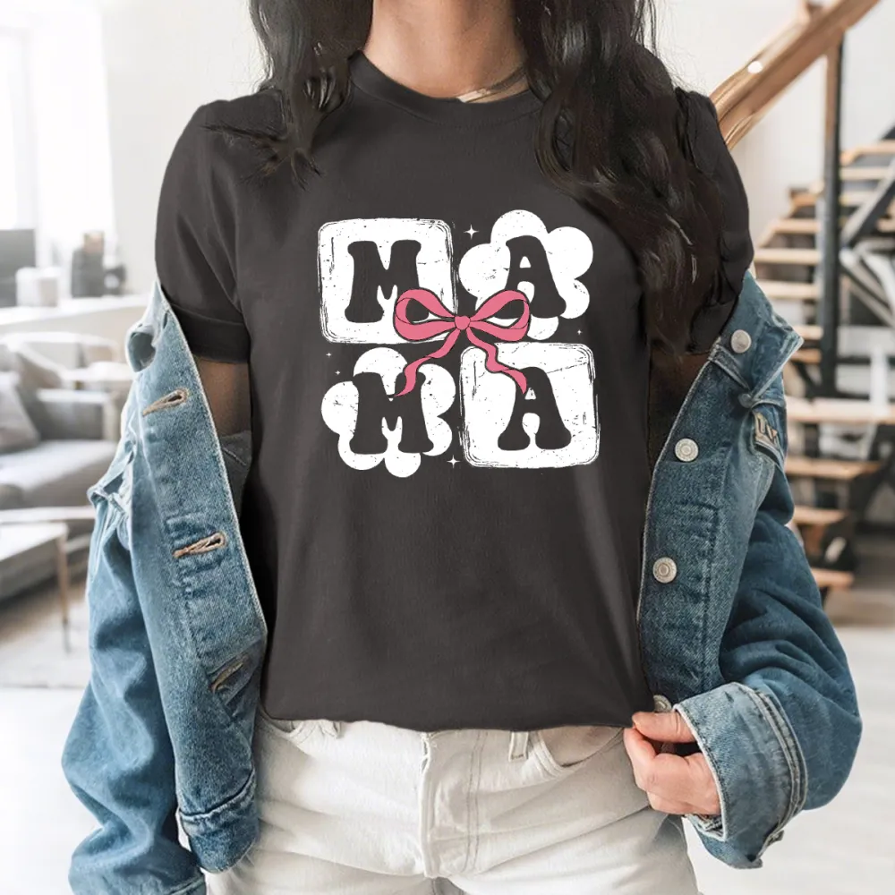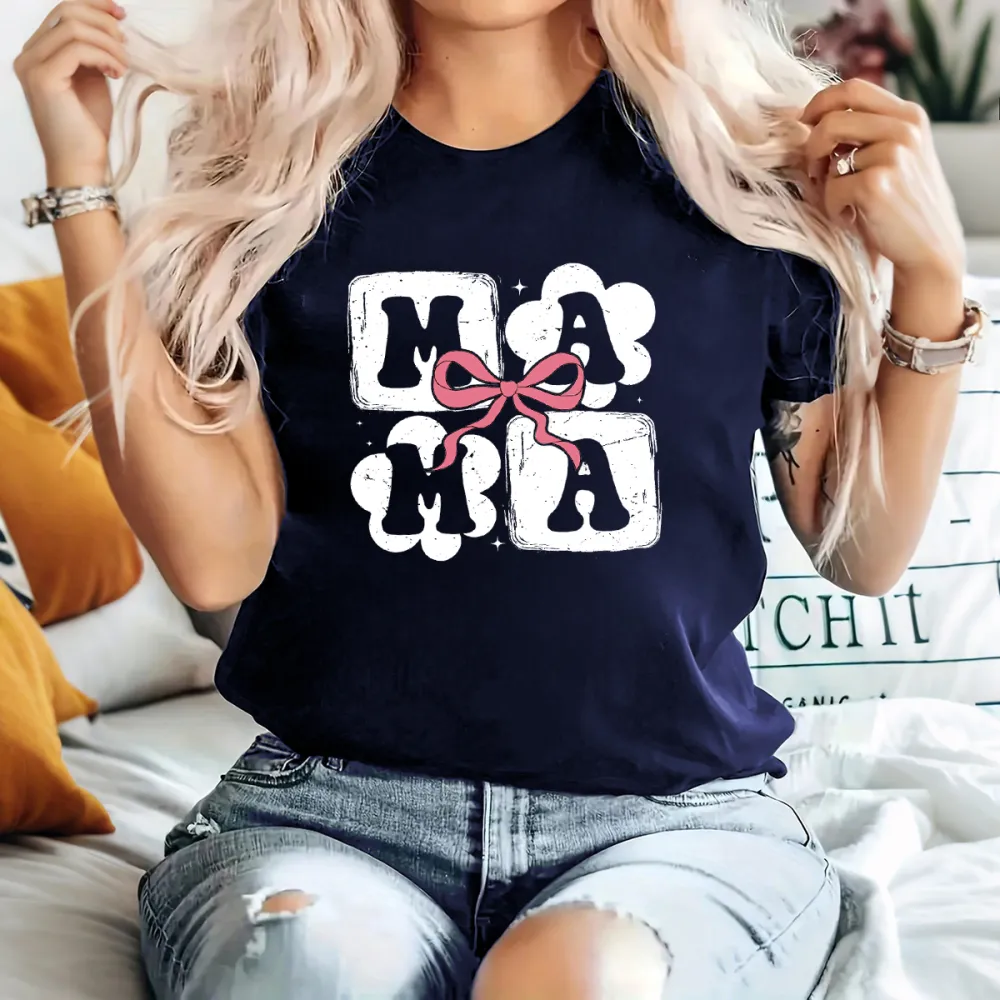 "Mama", Mother'S Day Slogan Pink Bow Pattern, Casual T-Shirt.