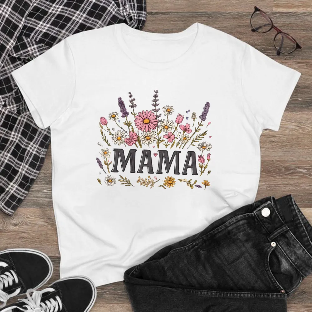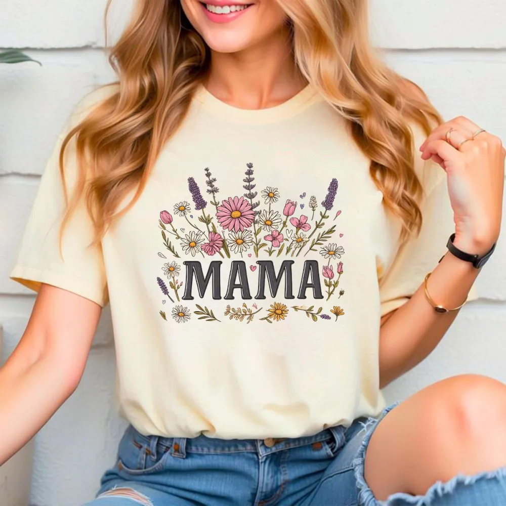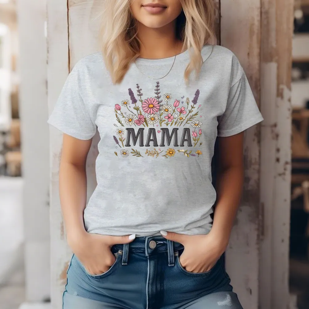 "Mama", Slogan And Plant And Flower Combination Pattern, Casual T-Shirt, Mommy T-Shirt.