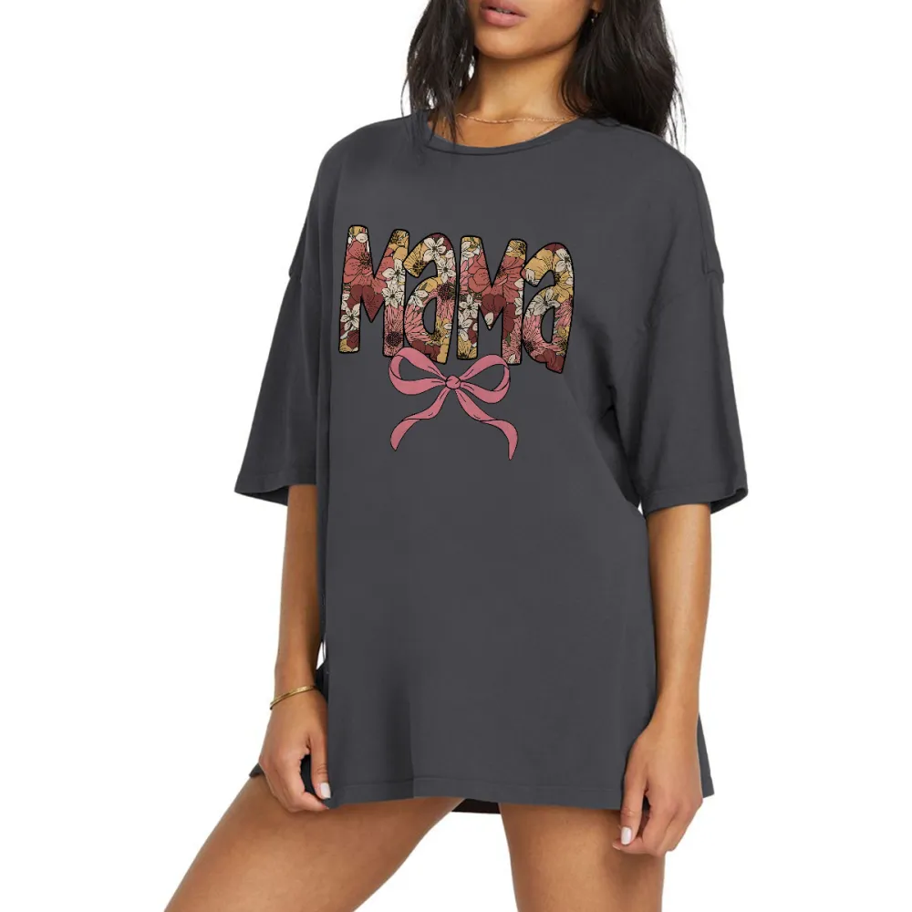 "Mama", Slogan Decorated With Floral Pattern And A Pink Bow Pattern, Casual T-Shirt, Mom Wear.