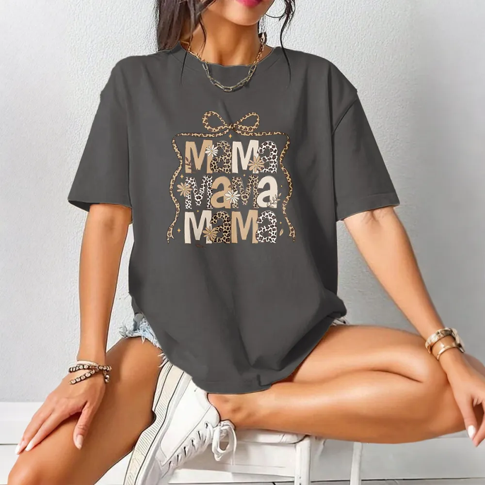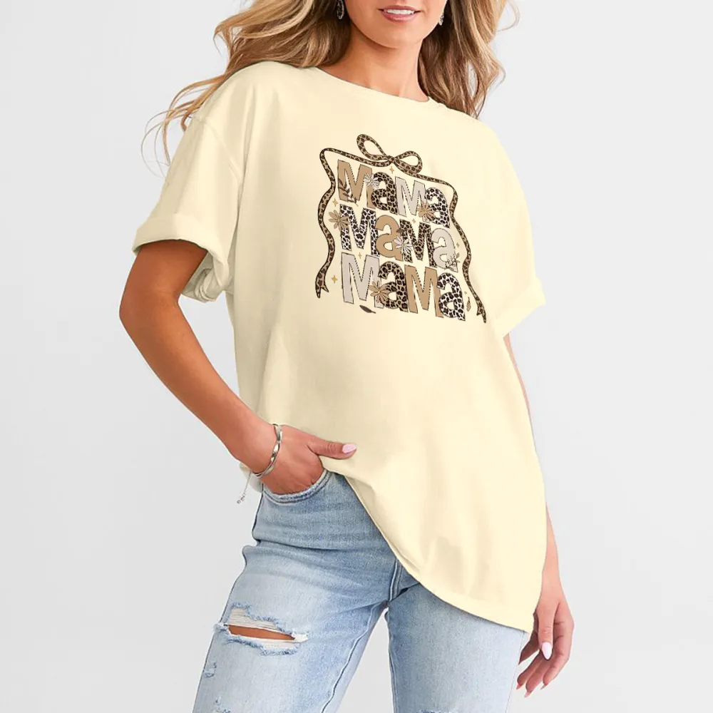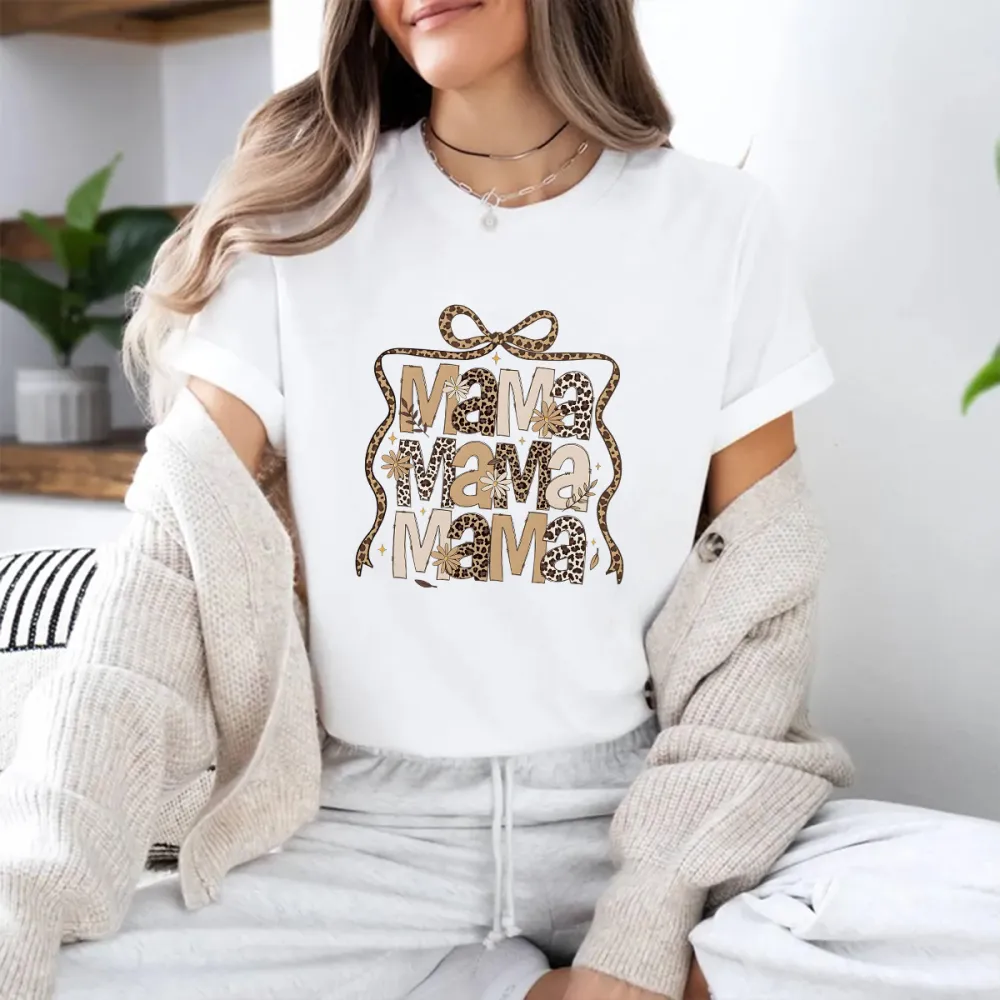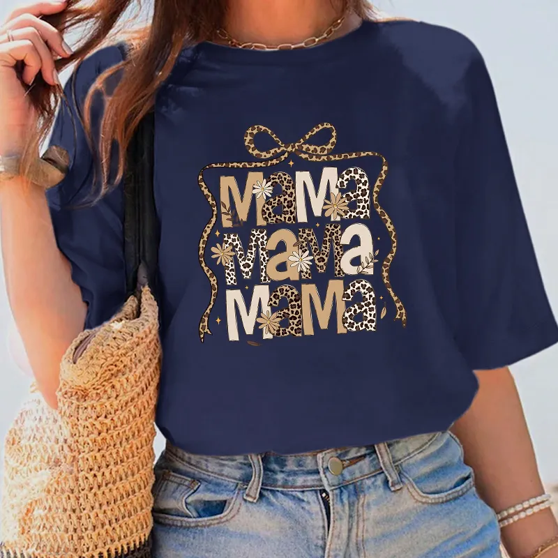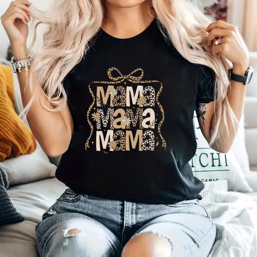 "Mama", Slogan Design Leopard Print And Star Decoration And A Bow Pattern, Casual T-Shirt.