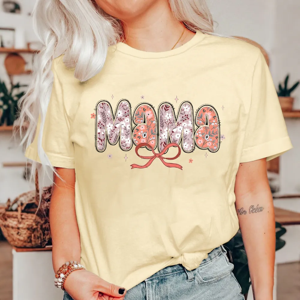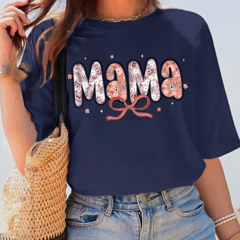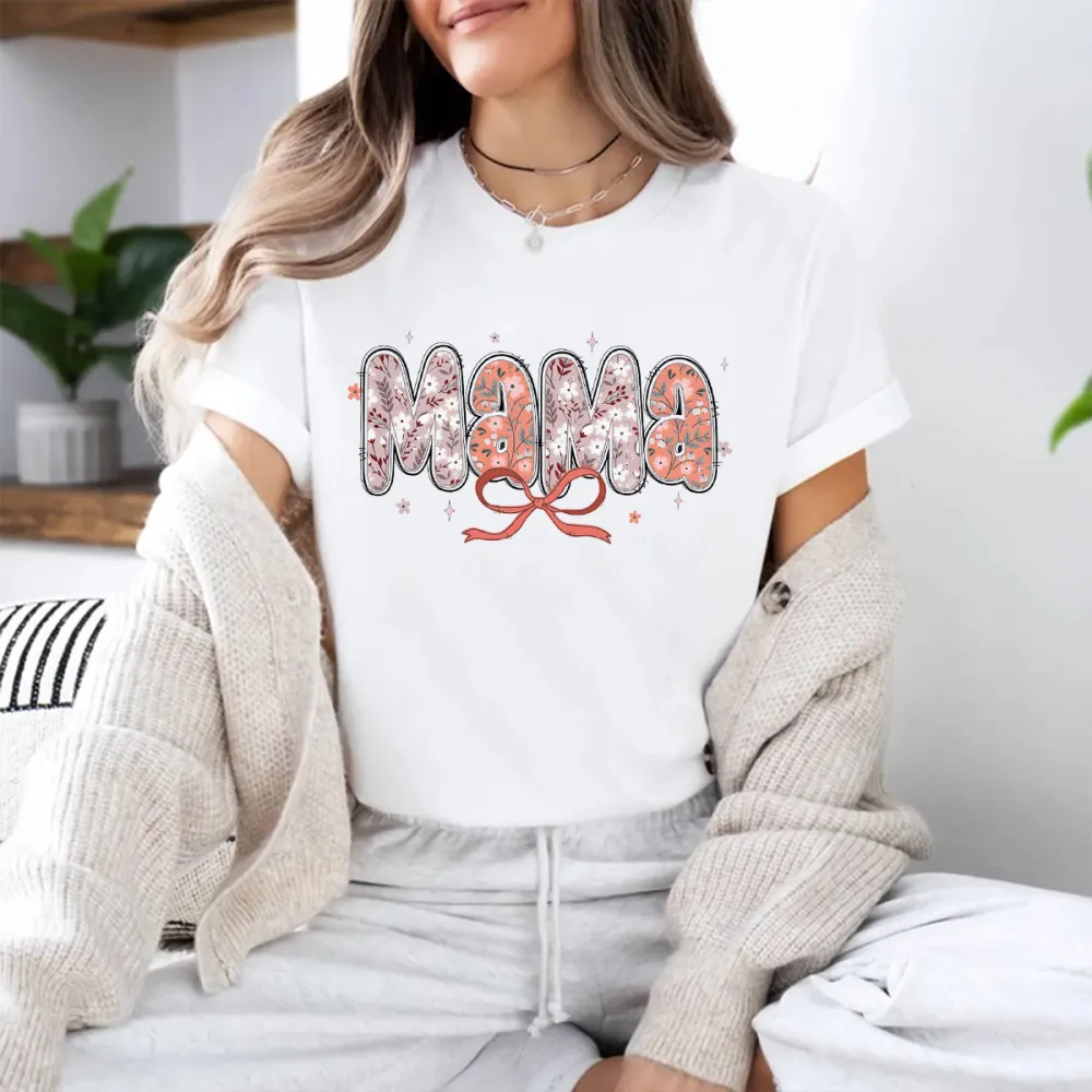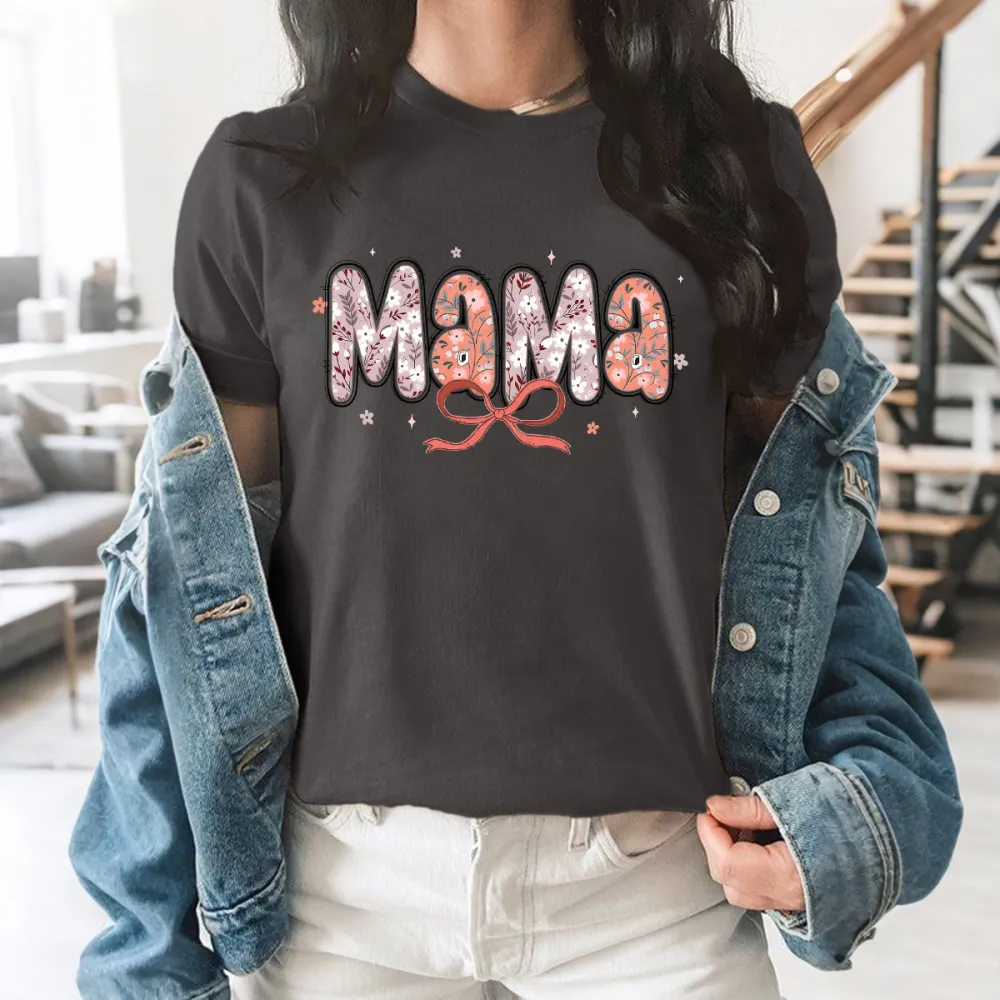 "Mama", Slogan Designed With Artistic Font Design Of Floral Pattern And Red Bow Pattern, Casual T-Shirt. 2025674