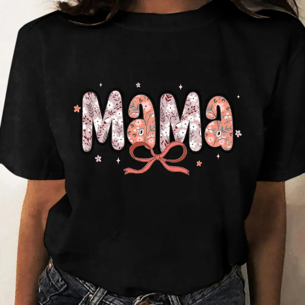 "Mama", Slogan Designed With Artistic Font Design Of Floral Pattern And Red Bow Pattern, Casual T-Shirt.