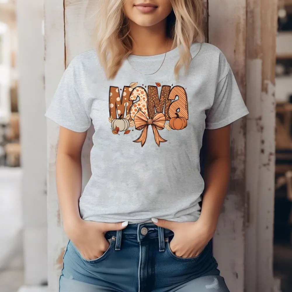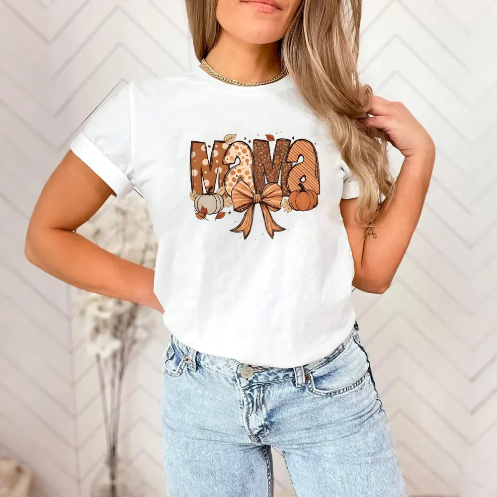 "Mama", Slogan Designed With Different Textures, Surrounded By A Combination Of Pumpkins, Autumn Leaves And An Orange Bow, Casual T-Shirt, Mommy T-Shirt.
