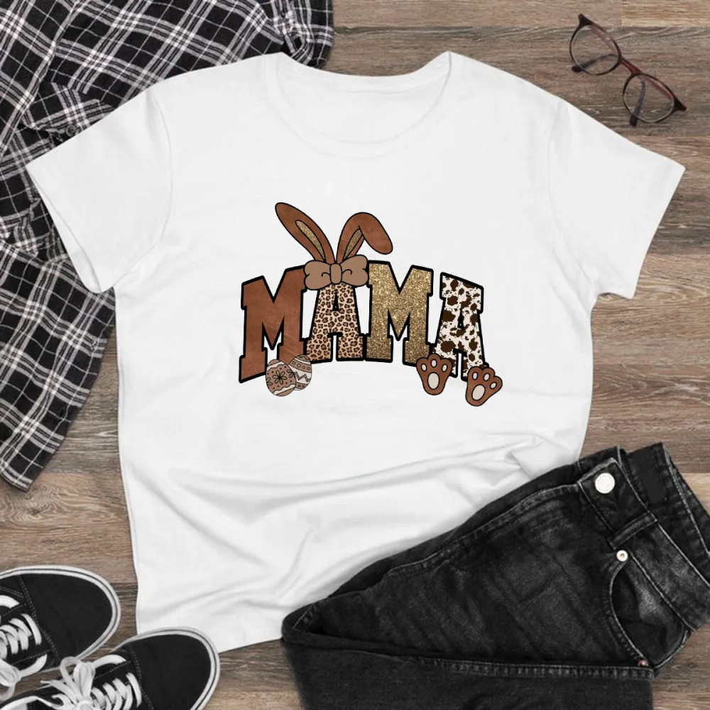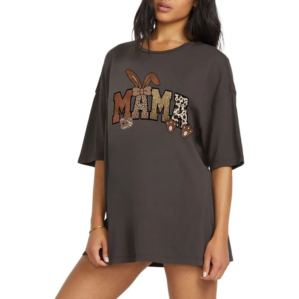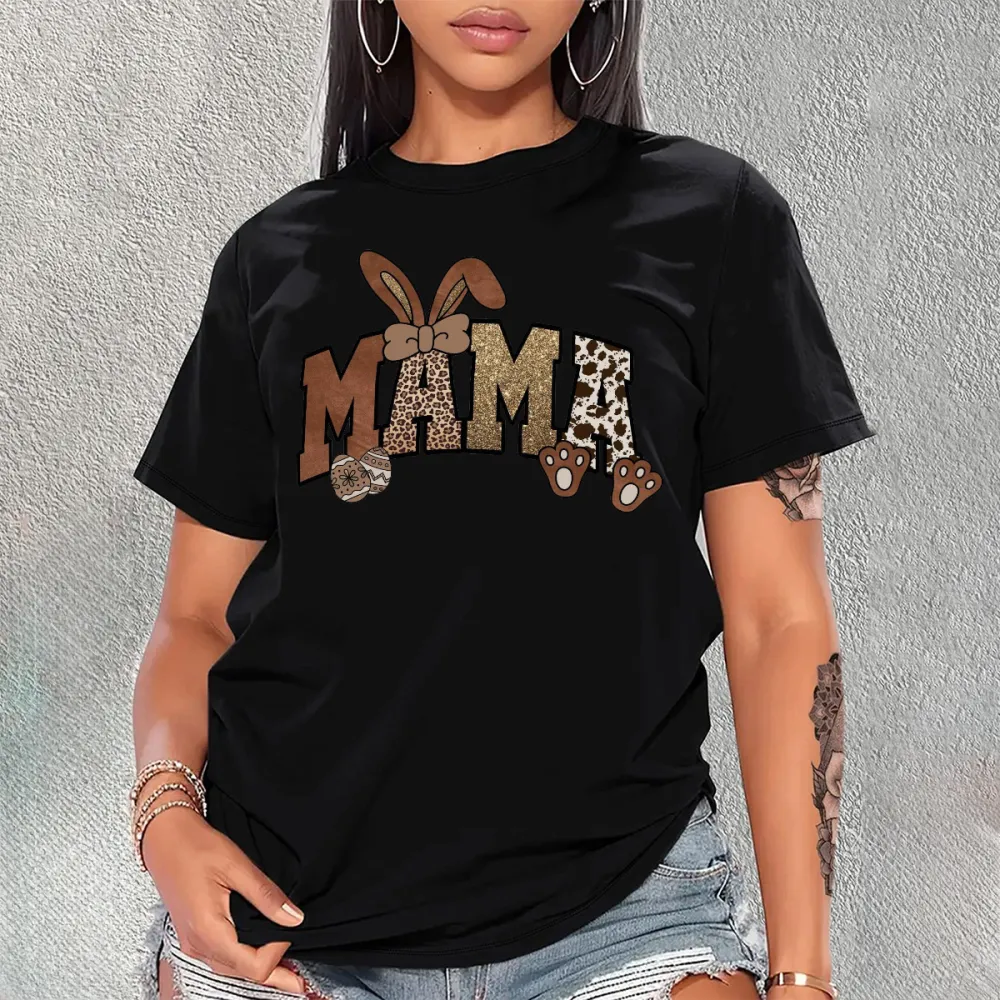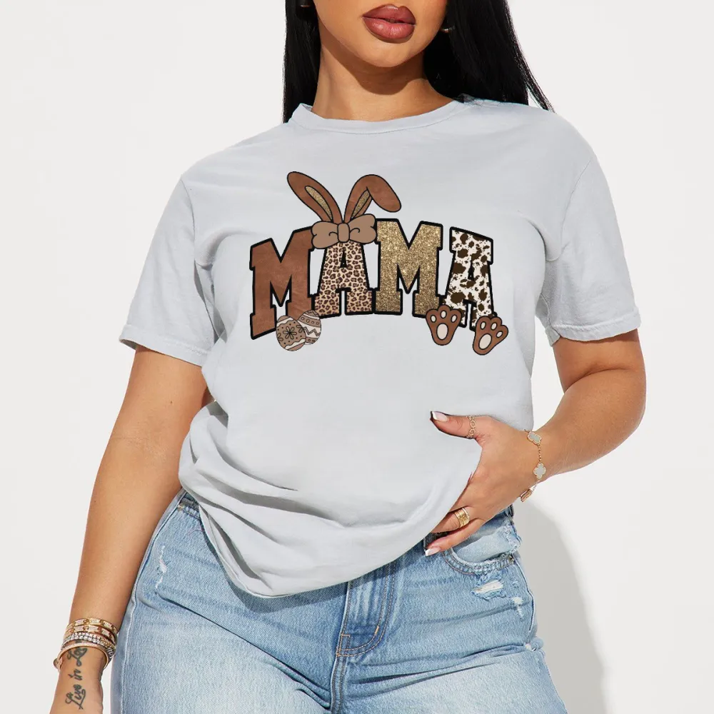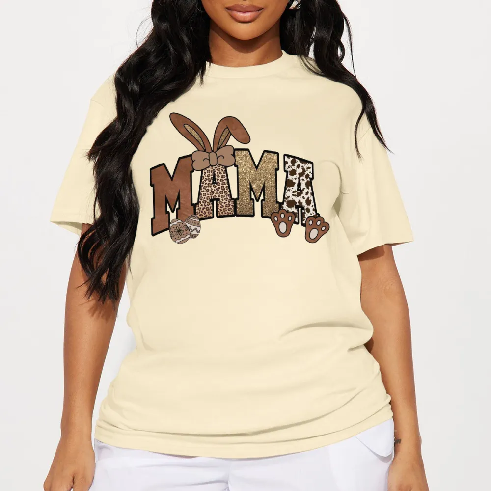 "Mama", The "M" Is Brown With A Leather Texture, The First "A" Is A Leopard Print, The Second "A" Is A Cow Spot And Brown Paw Print Pattern, A Pair Of Brown Bow Bunny Ears Pattern, And A Casual T-Shir 2027036