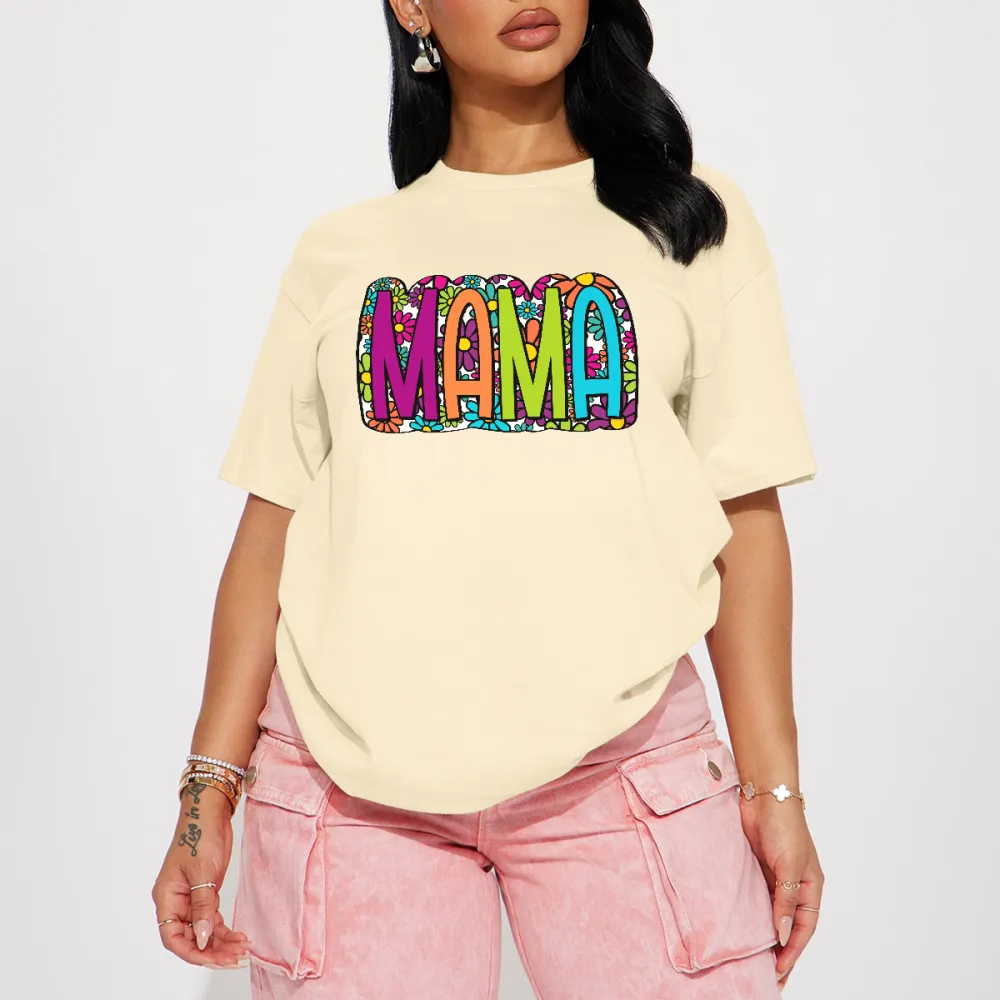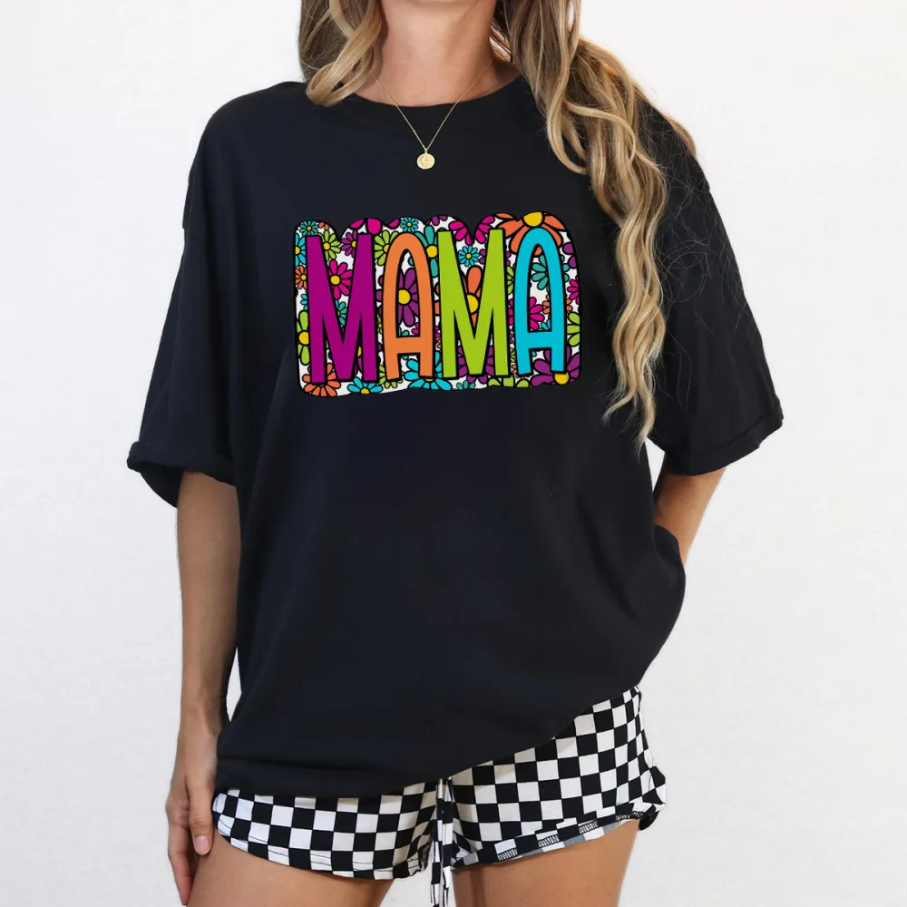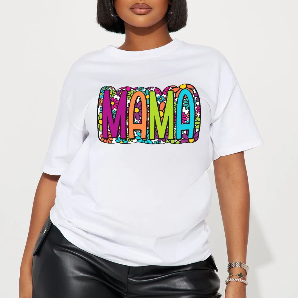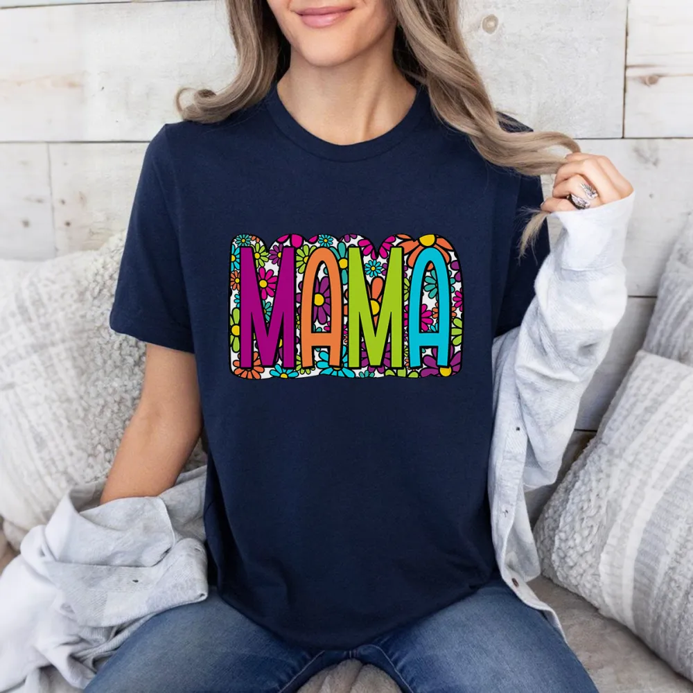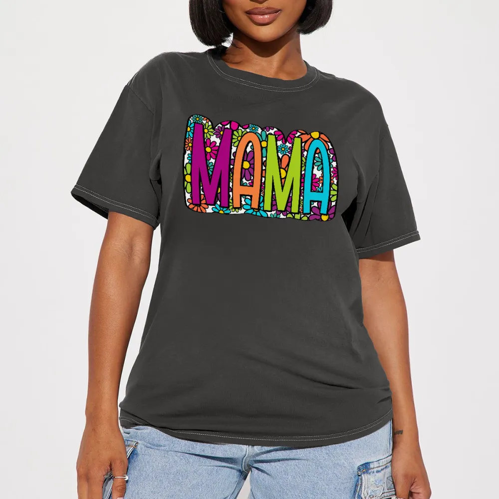 "Mama", The Letters Are In Rich And Varied Colors, And There Are Colorful Floral Patterns Around Them, A Casual T-Shirt.