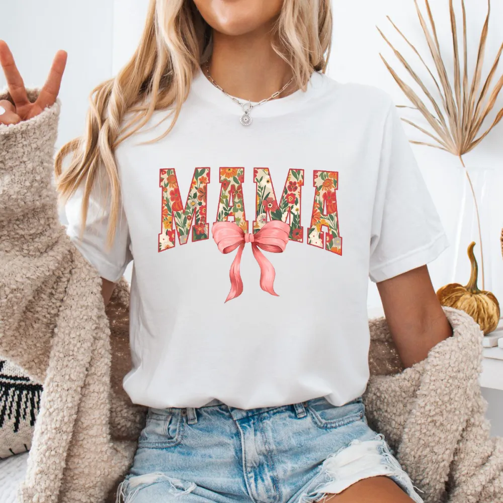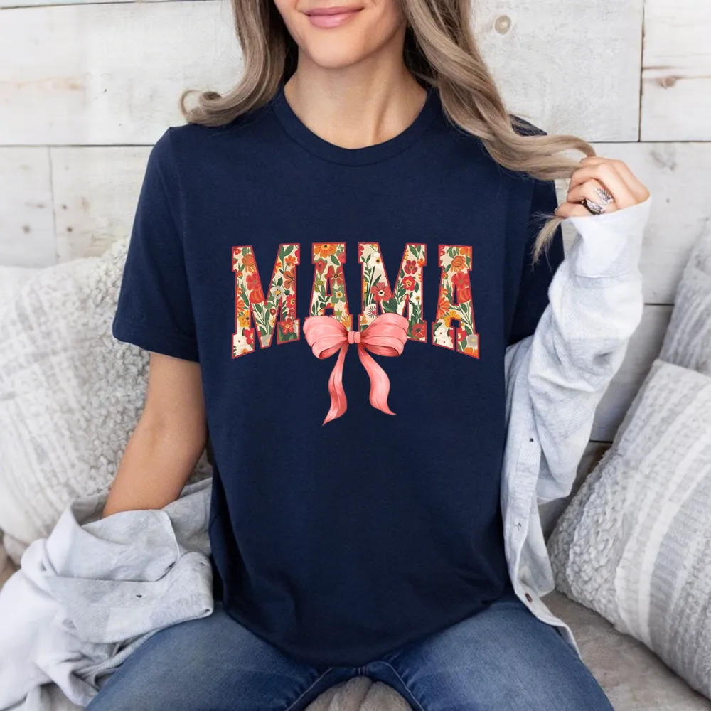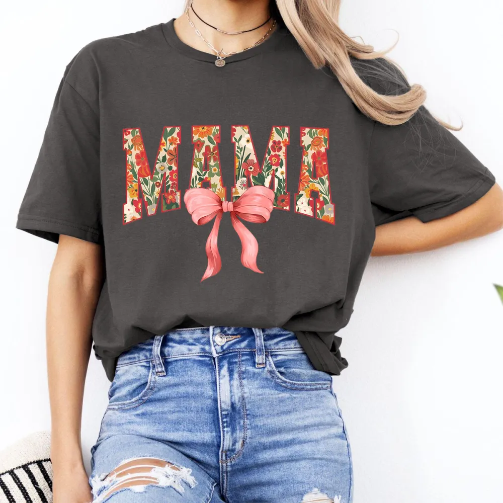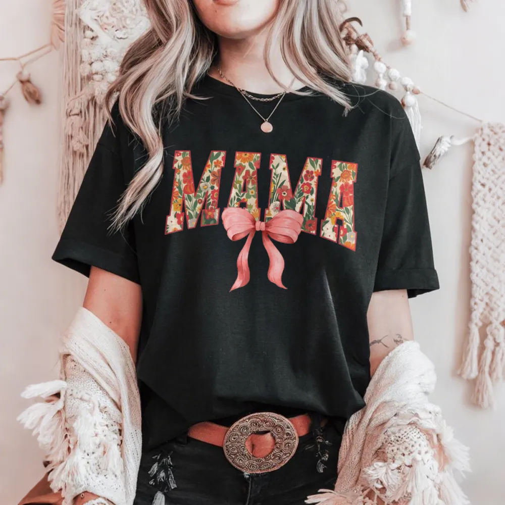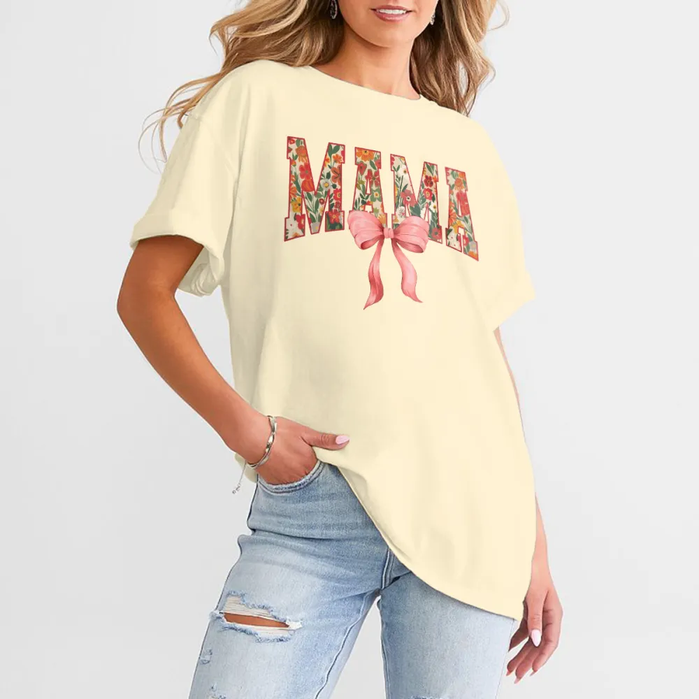 "Mama", The Slogan Is Made Up Of Various Floral Patterns And Tied With A Pink Bow Pattern, Casual T-Shirt. 2025914