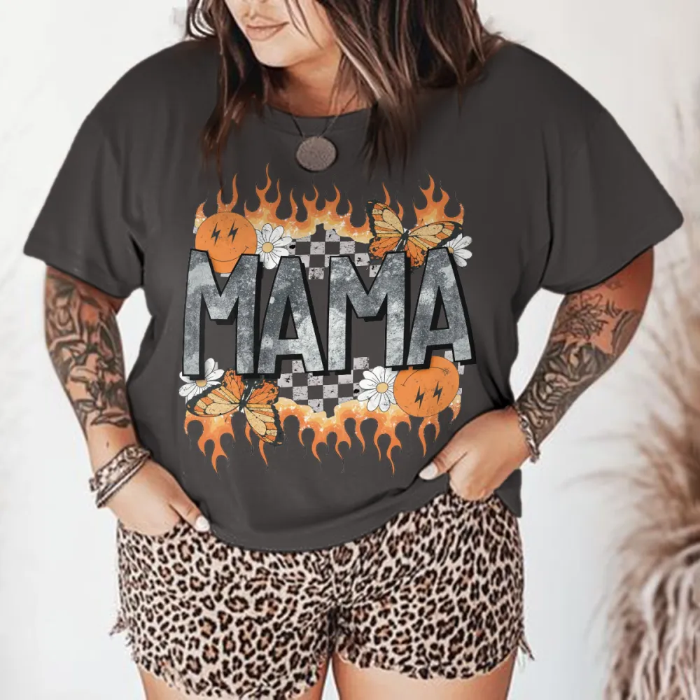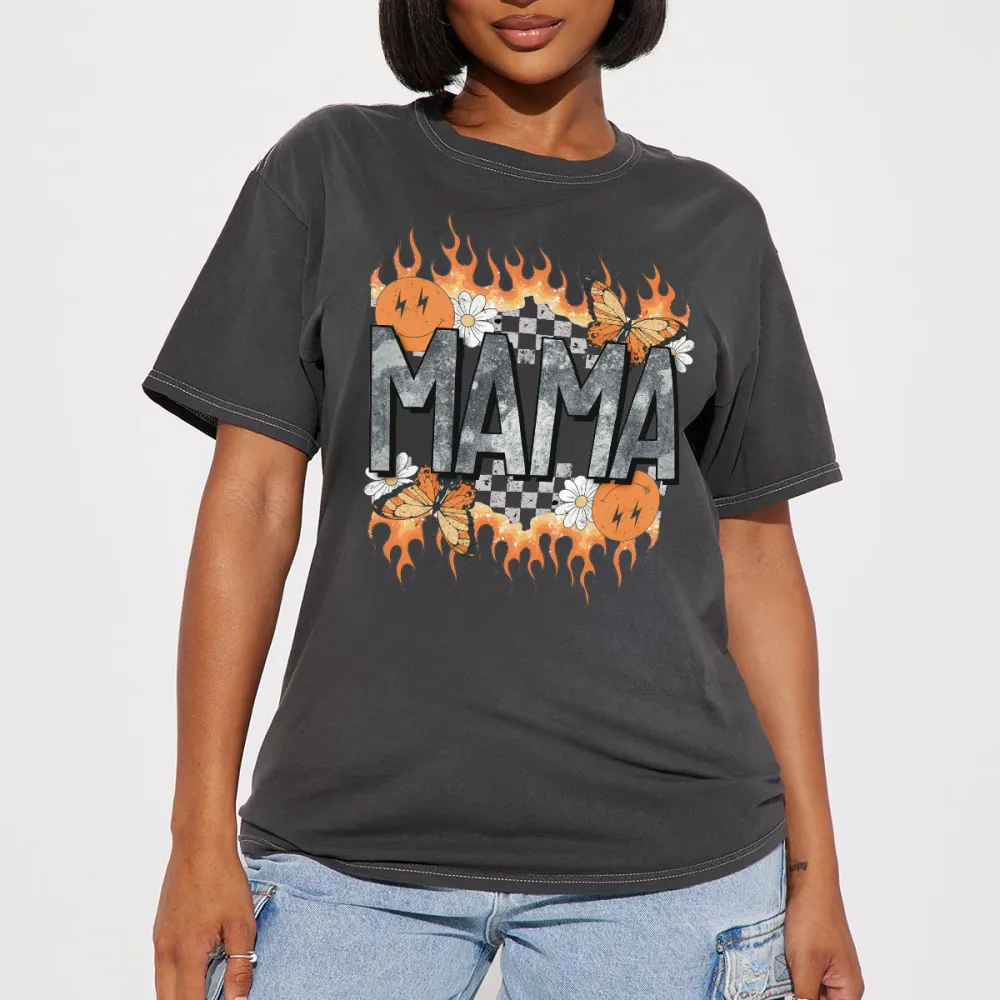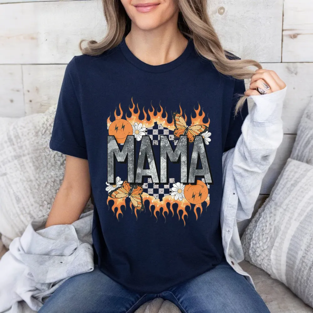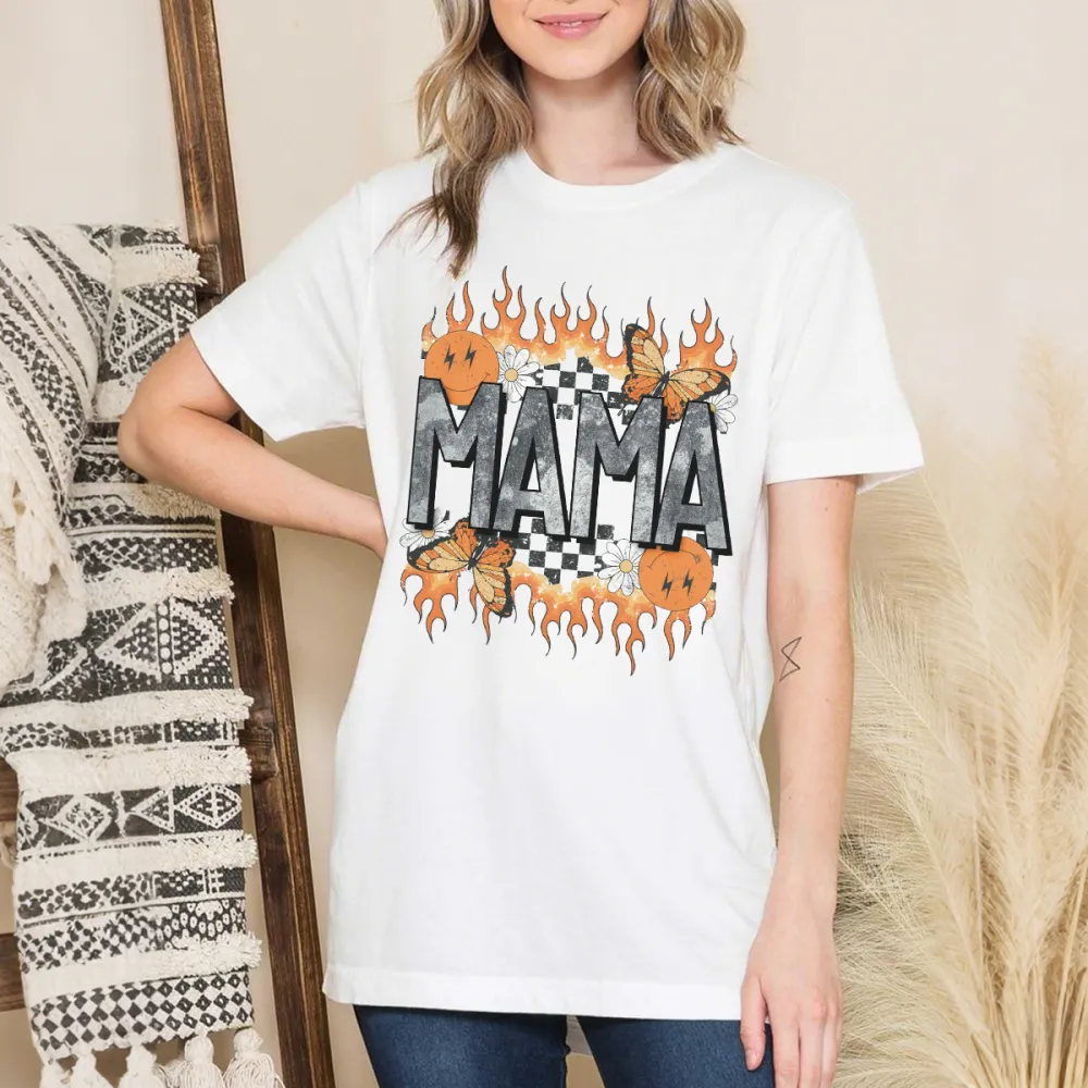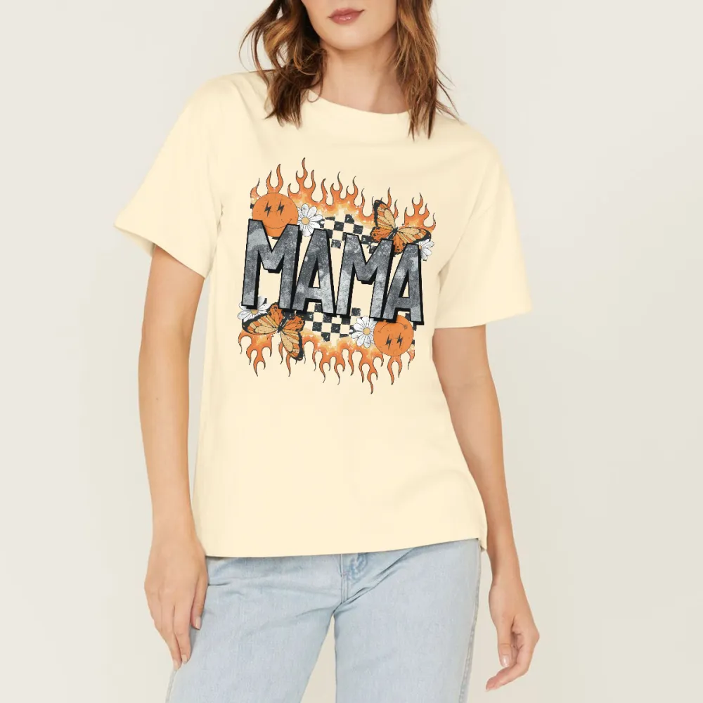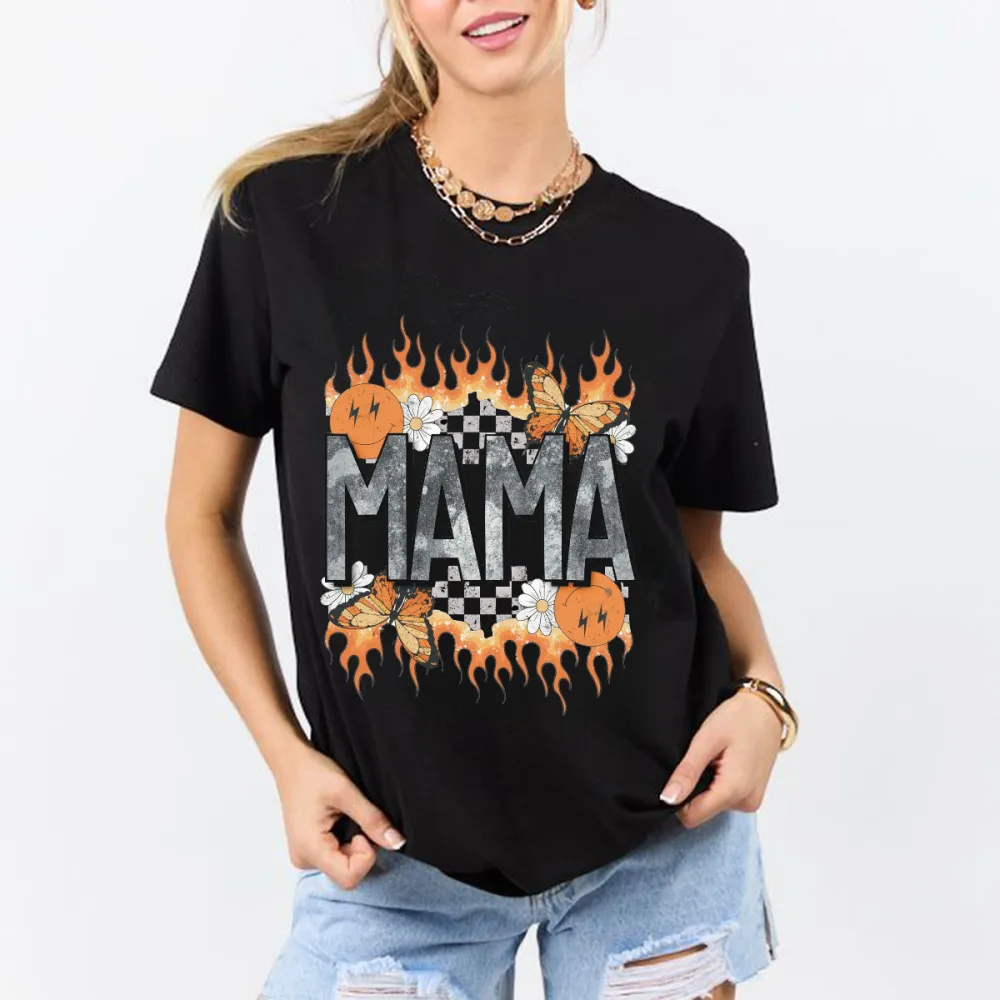 "Mama", The Slogan Is Surrounded By Orange Flame Decorations, Several Butterflies And Small White Flowers And A Black And White Checkerboard Pattern, A Casual T-Shirt.