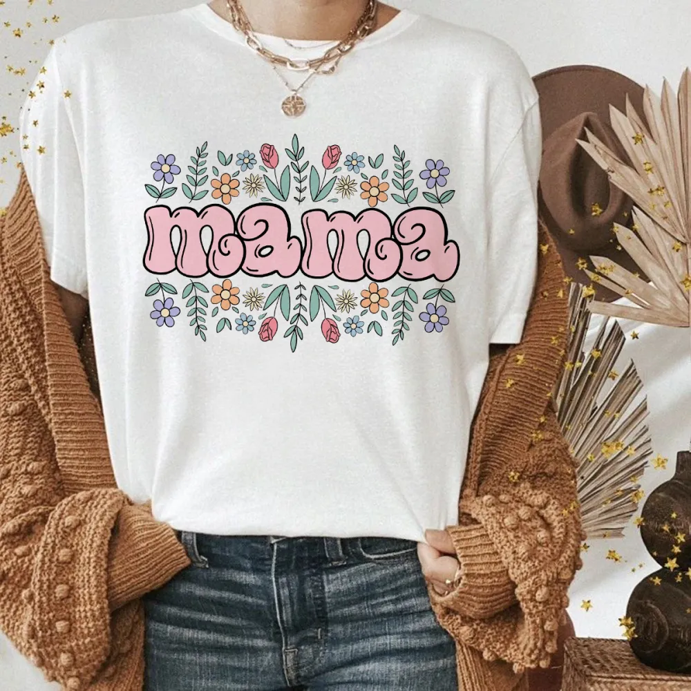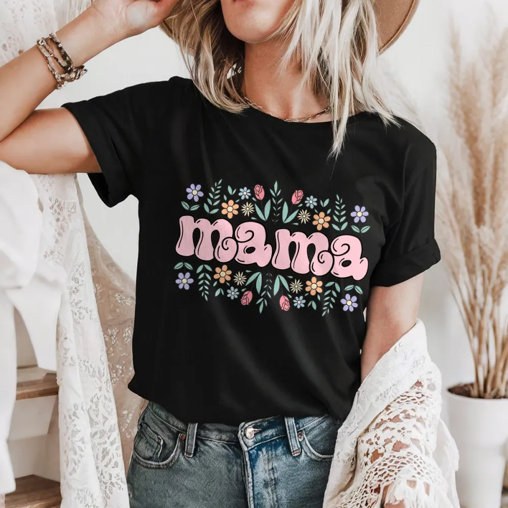 "Mama" Is Presented In Pink, Rounded Font, And The Slogan Is Surrounded By Various Colorful Flowers And Green Leaves On The Upper And Lower Sides. It Is A Casual T-Shirt.