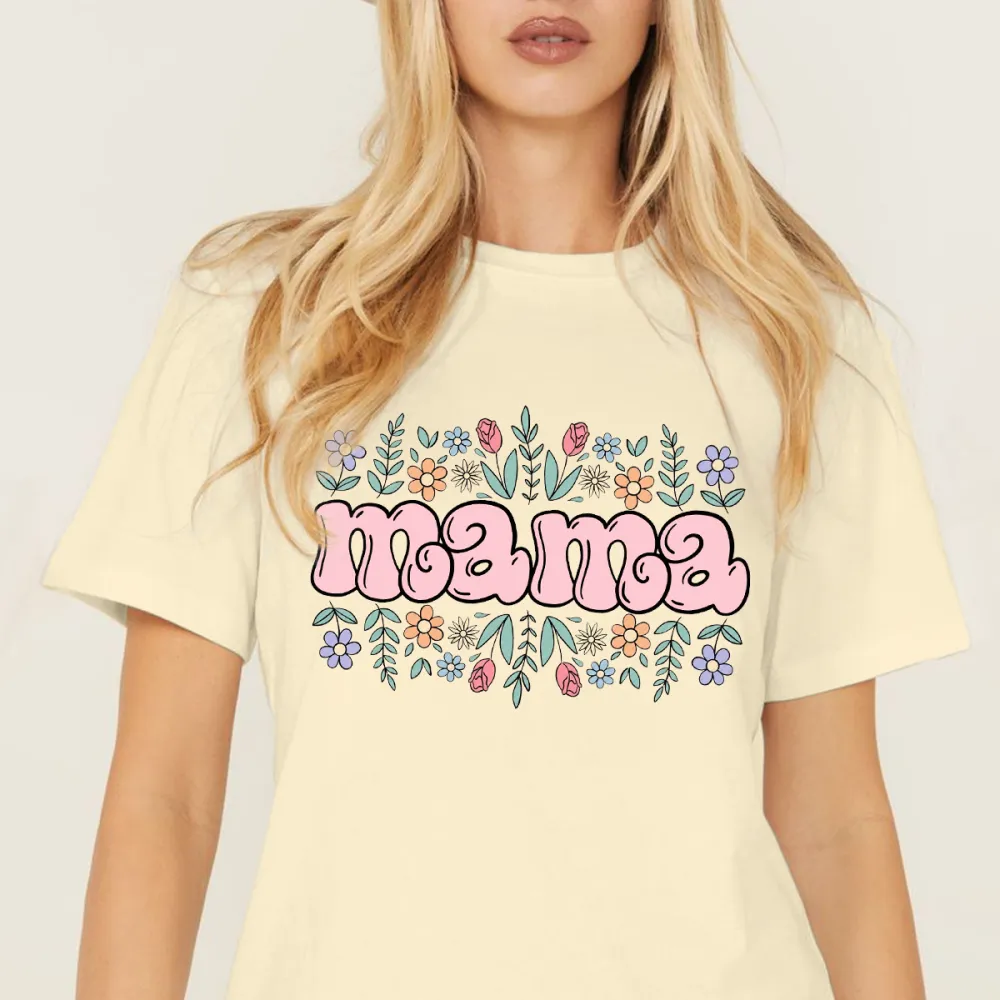 "Mama" Is Presented In Pink, Rounded Font, And The Slogan Is Surrounded By Various Colorful Flowers And Green Leaves On The Upper And Lower Sides. It Is A Casual T-Shirt. 2026748