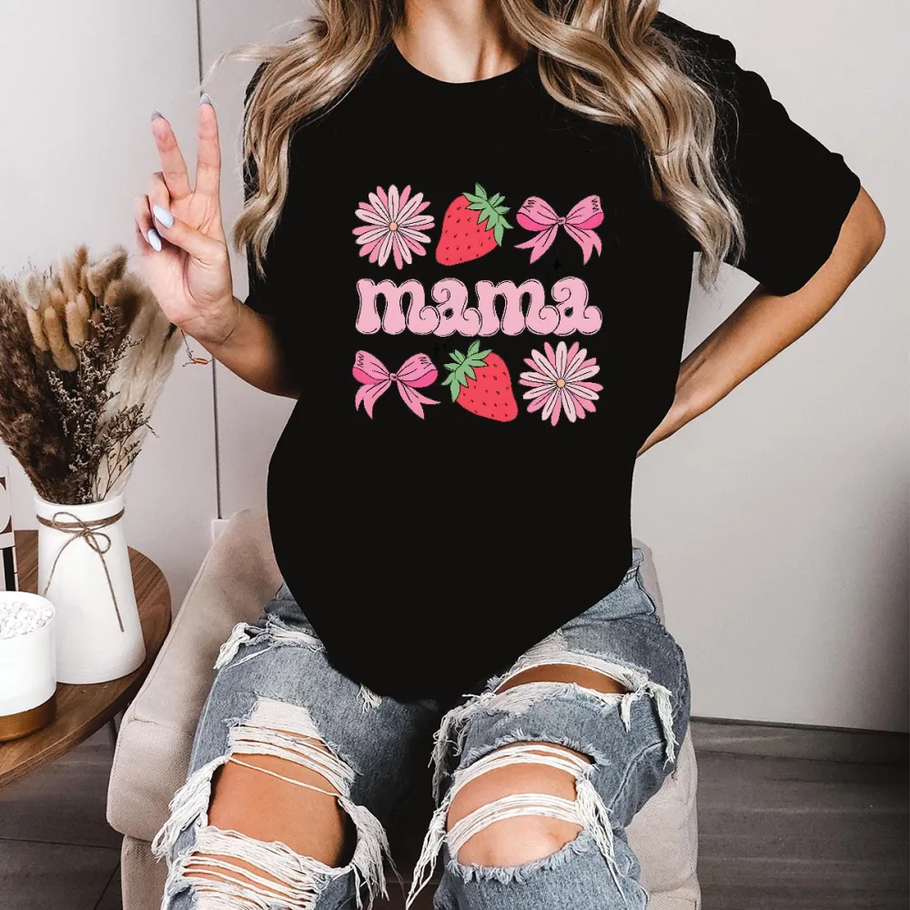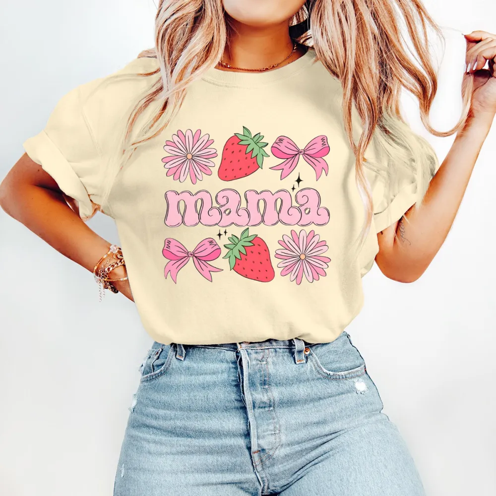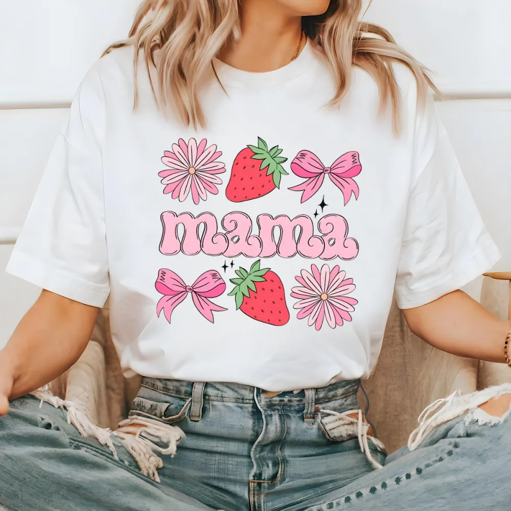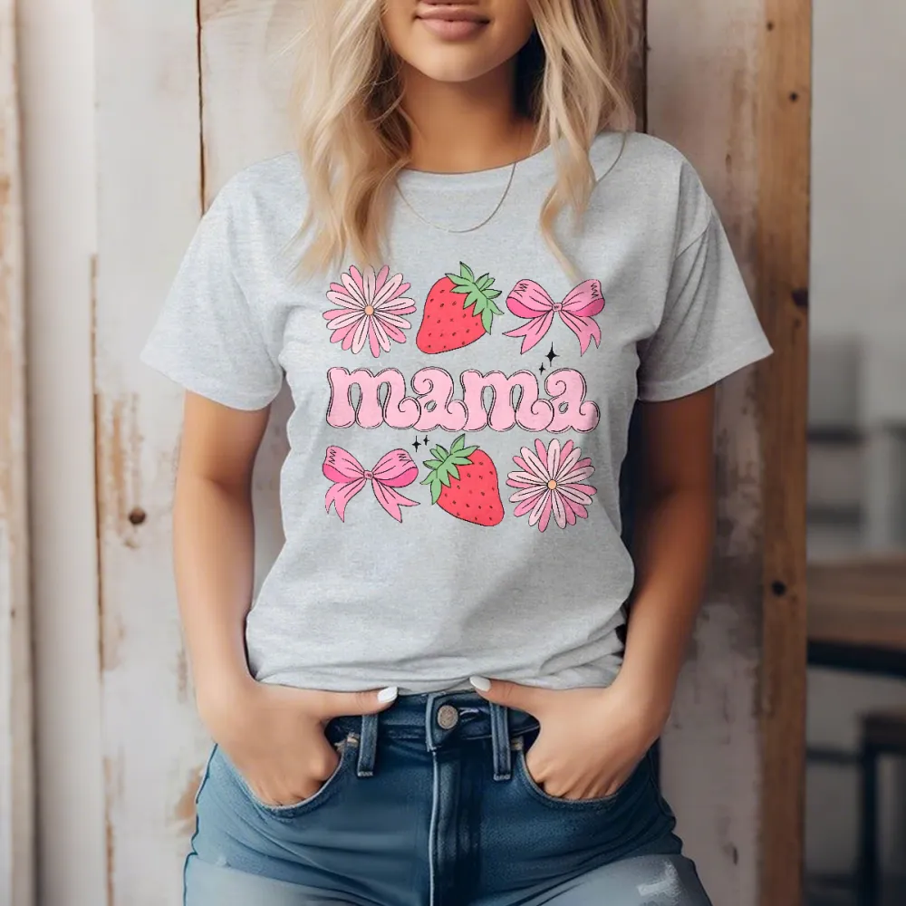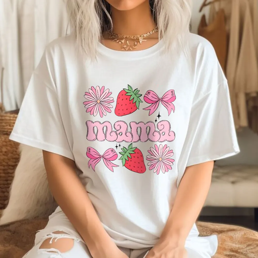 "Mama" Is Presented In Pink Letters And Combined With Pink Bows, Pink Daisies, And Strawberries On A Casual T-Shirt.