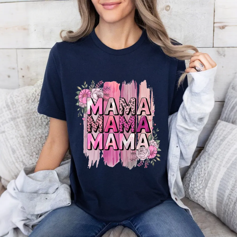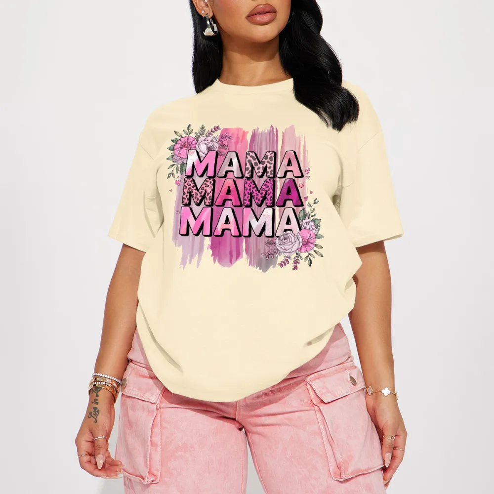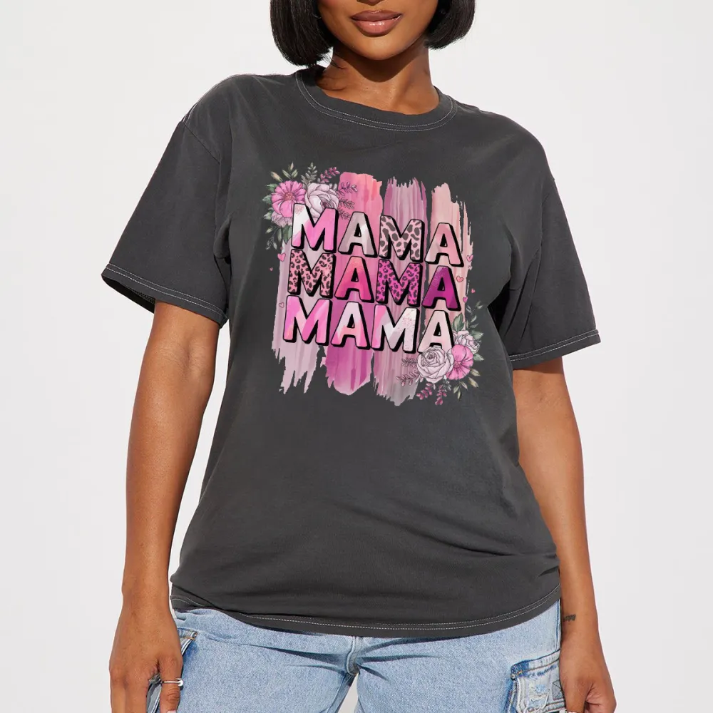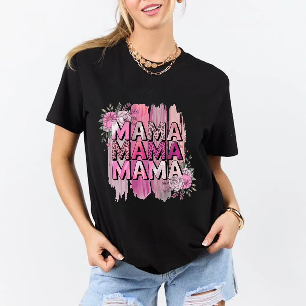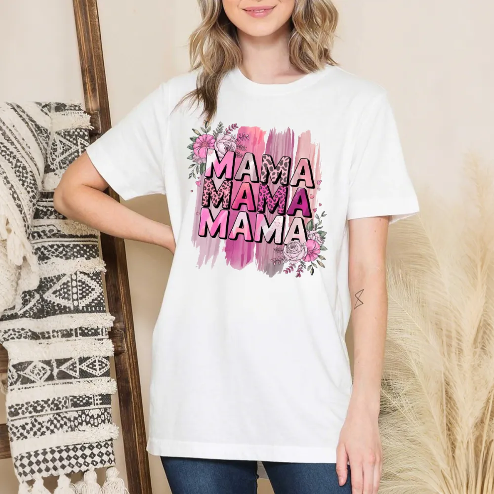 "Mama" Is Written Three Times Repeatedly, With A Pink Watercolor Brushstroke Effect And Dotted With Flower Patterns. The Overall Style Is Warm And Cute, And It Is A Casual T-Shirt. 2026232