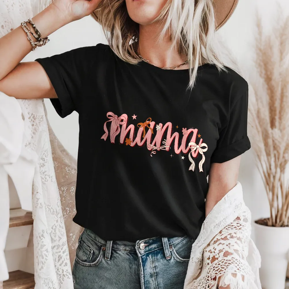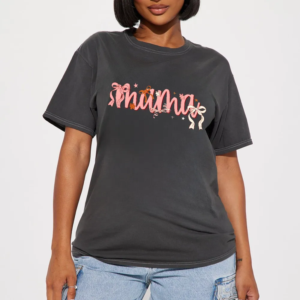 "Mama" Pink Handwritten Style, Slogan And Bows, Stars, Flowers And Other Combination Patterns, Casual T-Shirt. 2026766