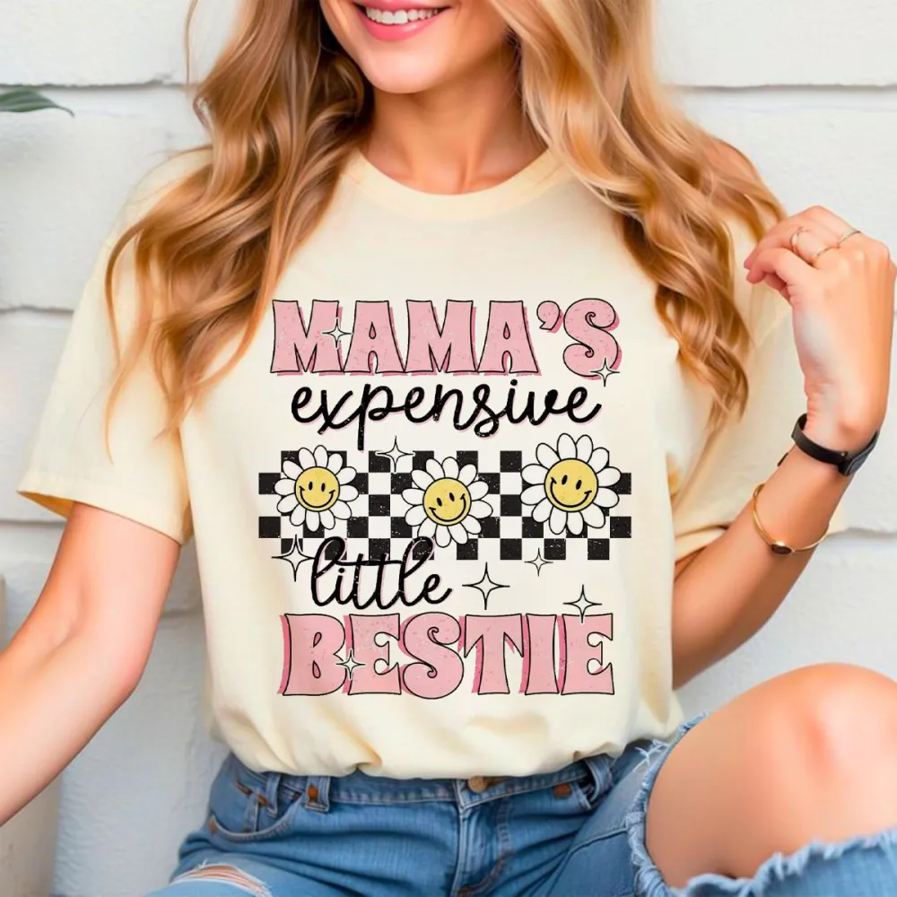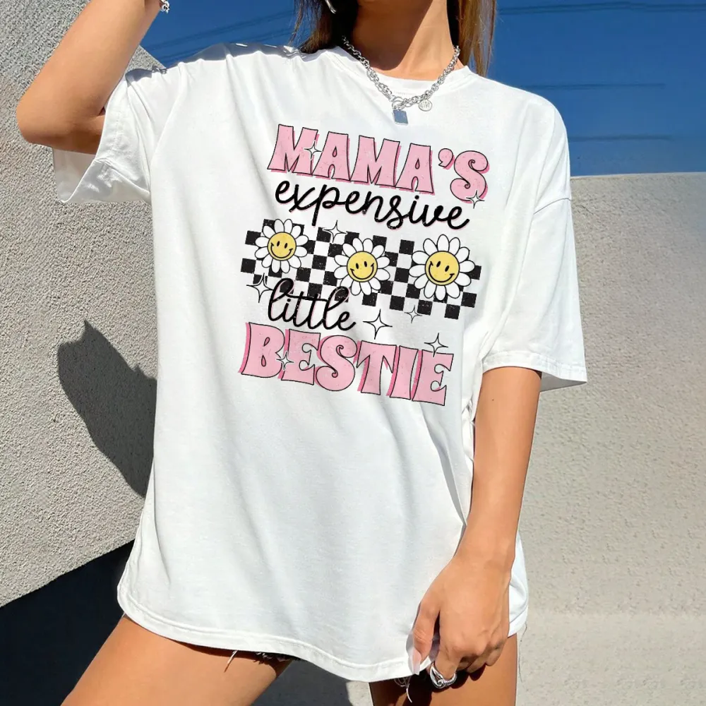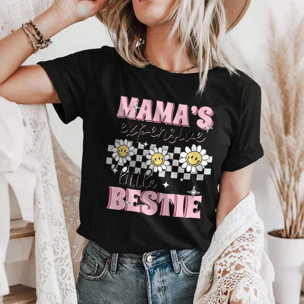 "Mama'S Expensive Little Bestie", Slogan And Black And White Checkerboard Strips, Dotted With Daisy Patterns With Smiling Faces, Casual T-Shirt. 2026076