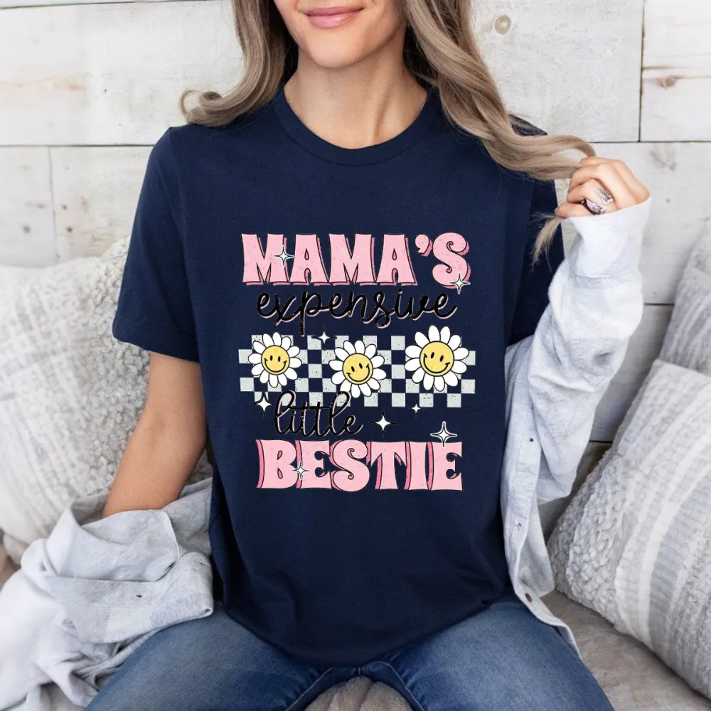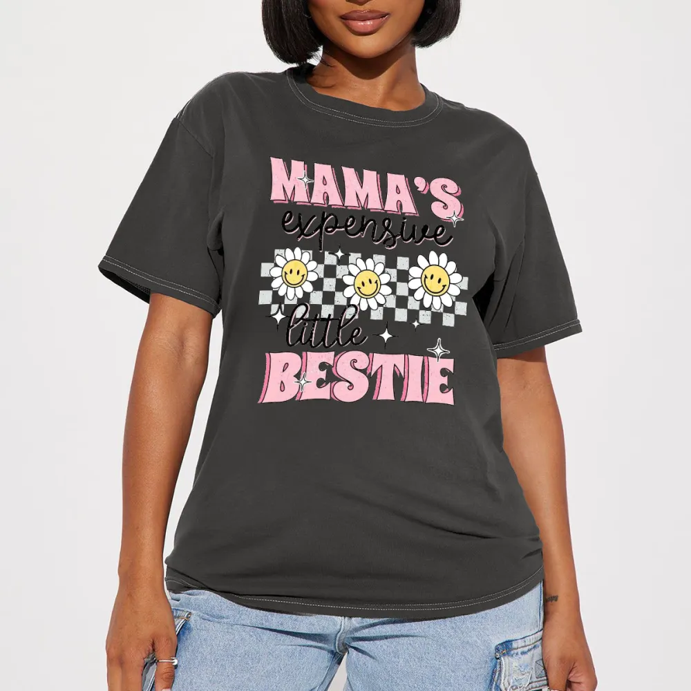 "Mama'S Expensive Little Bestie", Slogan And Black And White Checkerboard Strips, Dotted With Daisy Patterns With Smiling Faces, Casual T-Shirt.