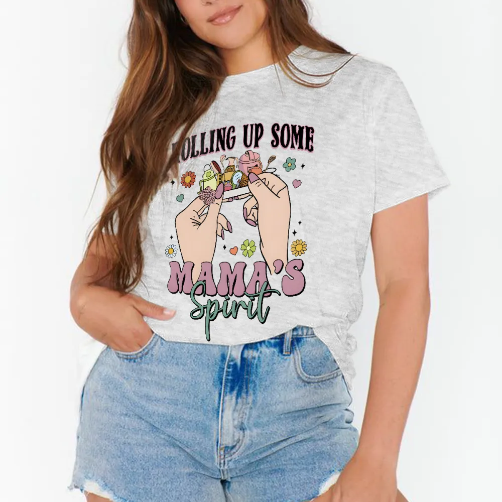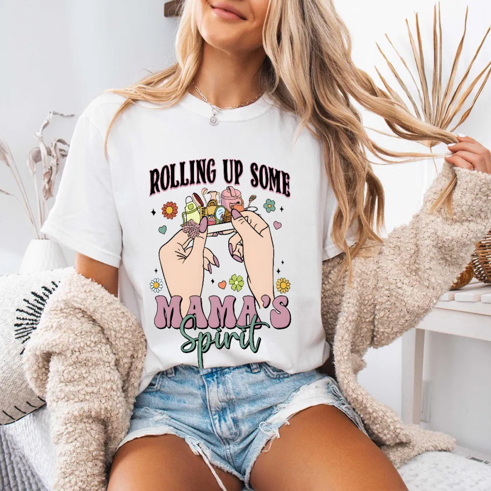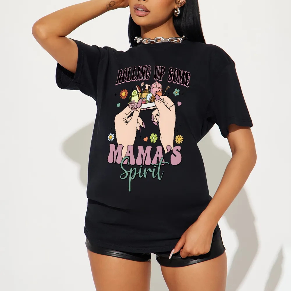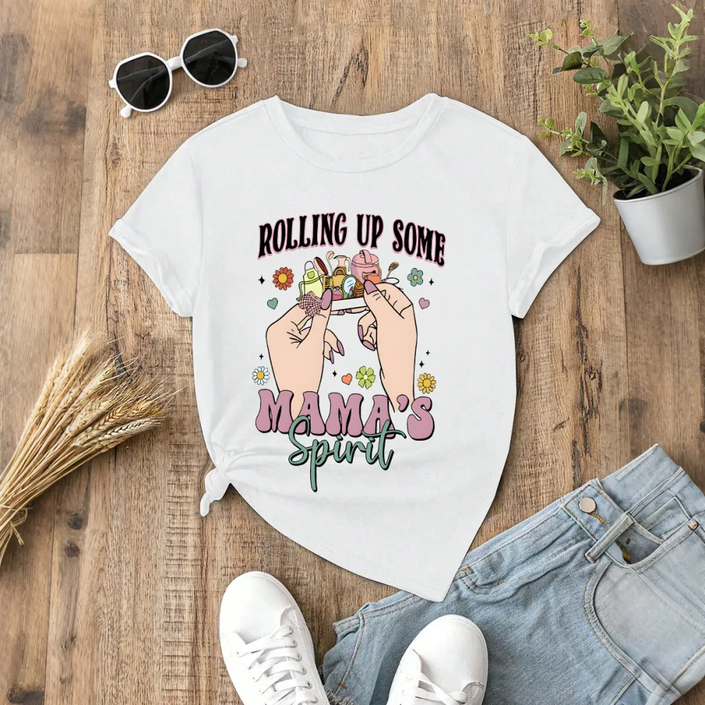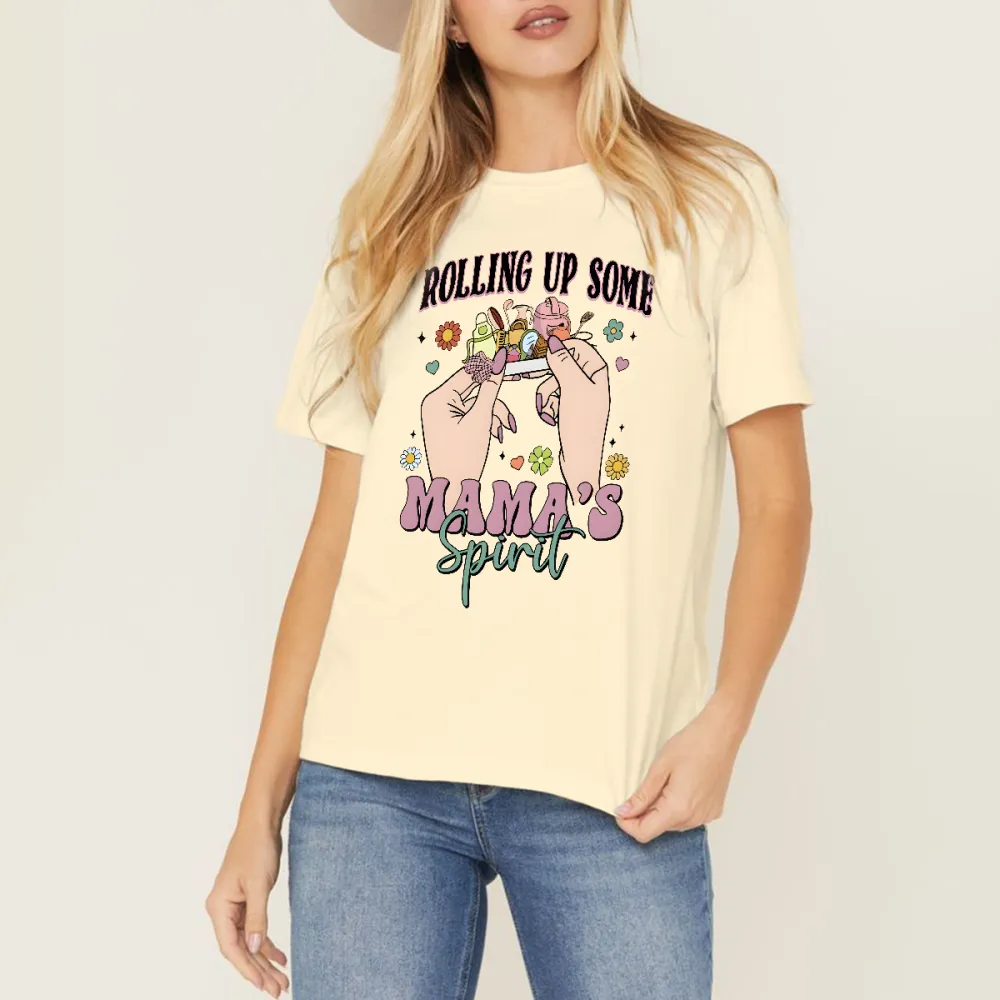 "Rolling Up Some Mama'S Spirit", The Pattern Is Two Hands Holding Cigarette Papers, With Flowers, Candies And Other Combination Patterns On It, Casual T-Shirt.
