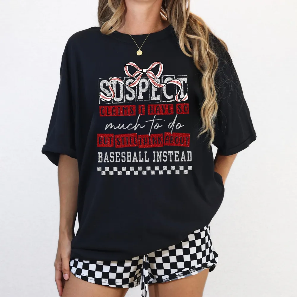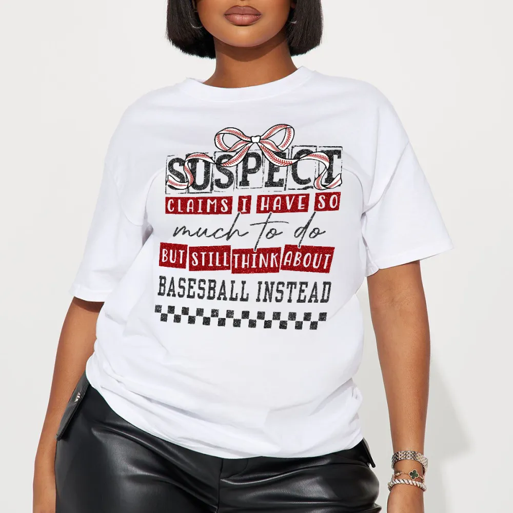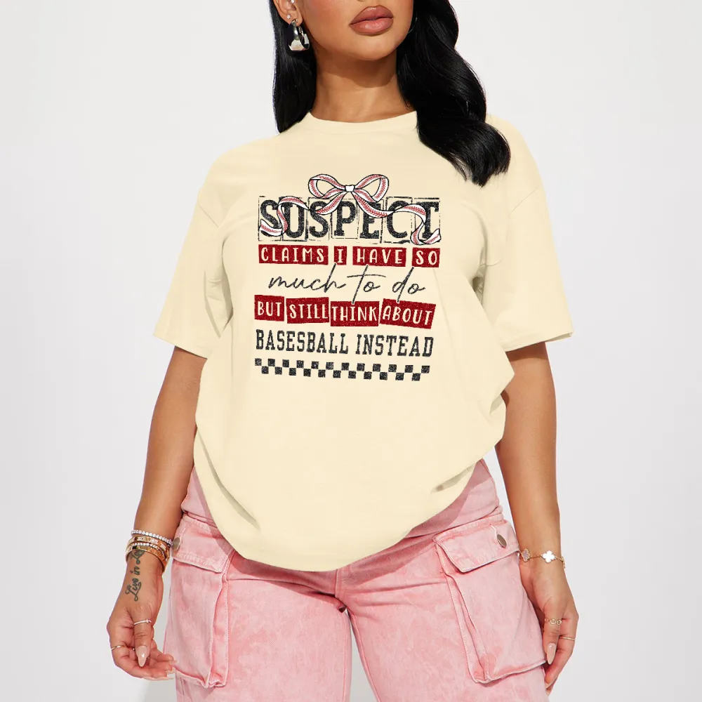 "Sos Pitch", "Clairs I Have So Much To Do But Still Think About Baseball Instead", Slogan And A Bow Graphic, Casual T-Shirt. 2028479