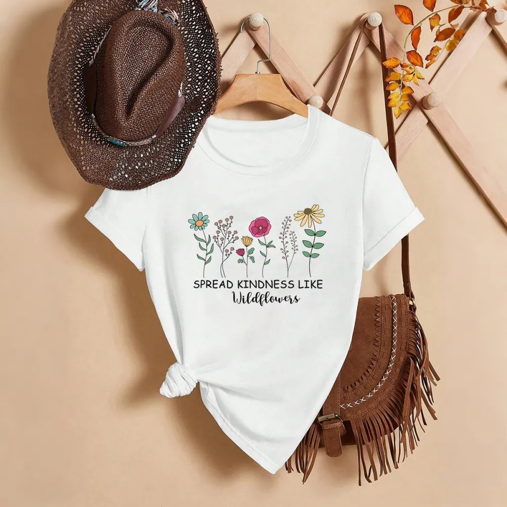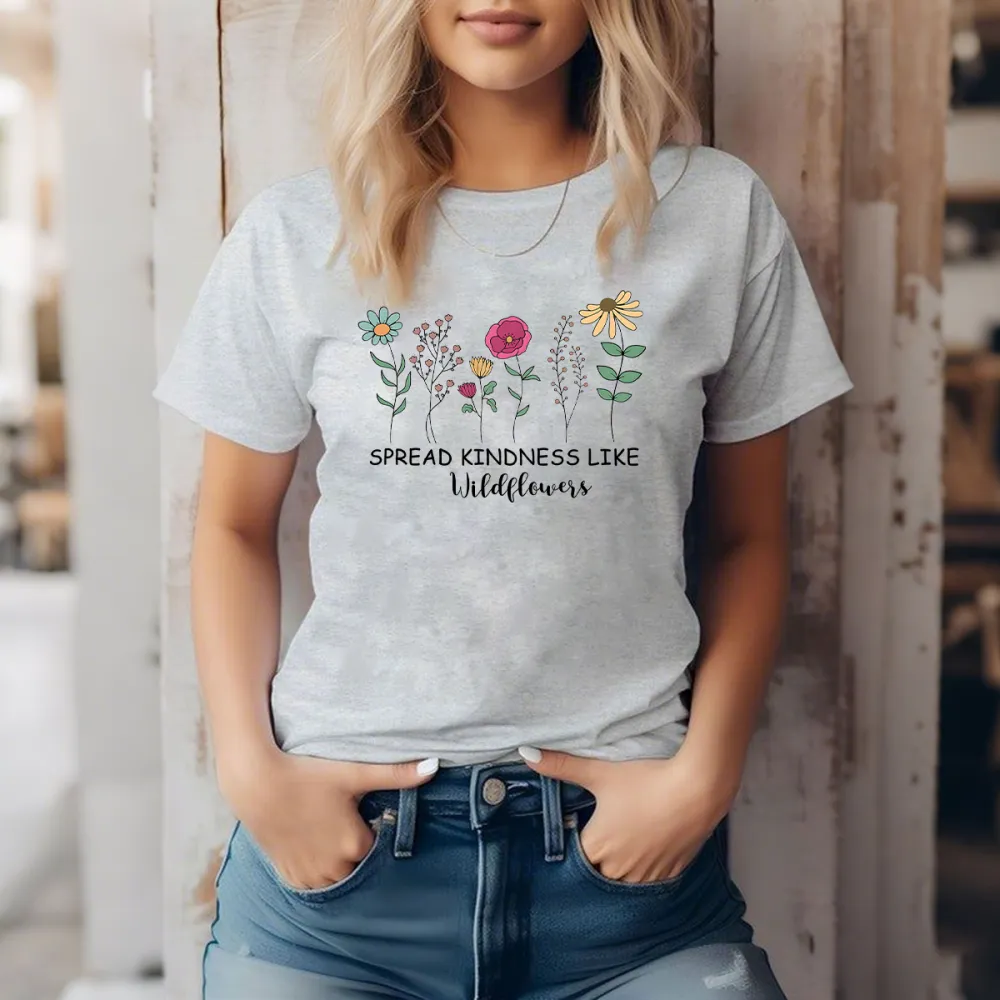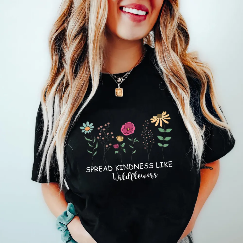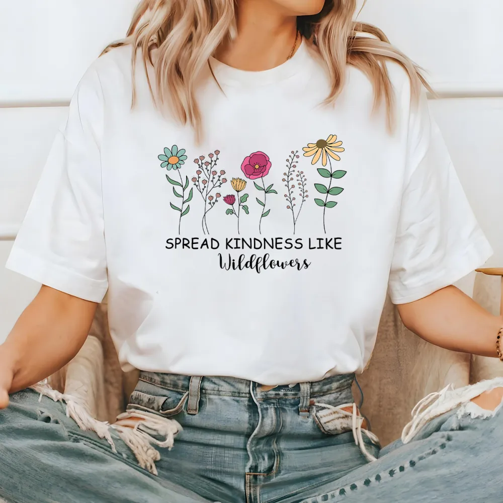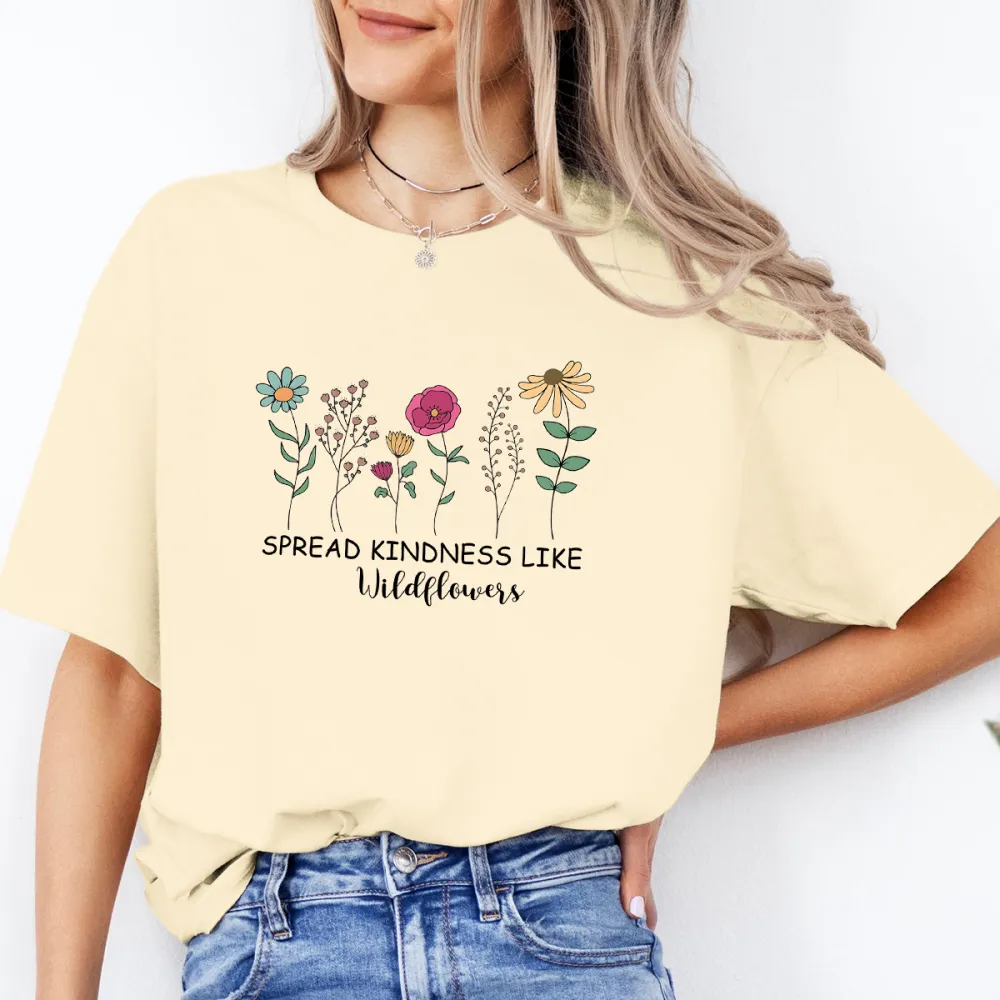"Spread Kindness Like Wildflowers" Slogan And Simple Drawings Of Different Kinds Of Flowers, Including Blue Flowers, Pink Roses, And Yellow Daisy Patterns, Casual T-Shirts.