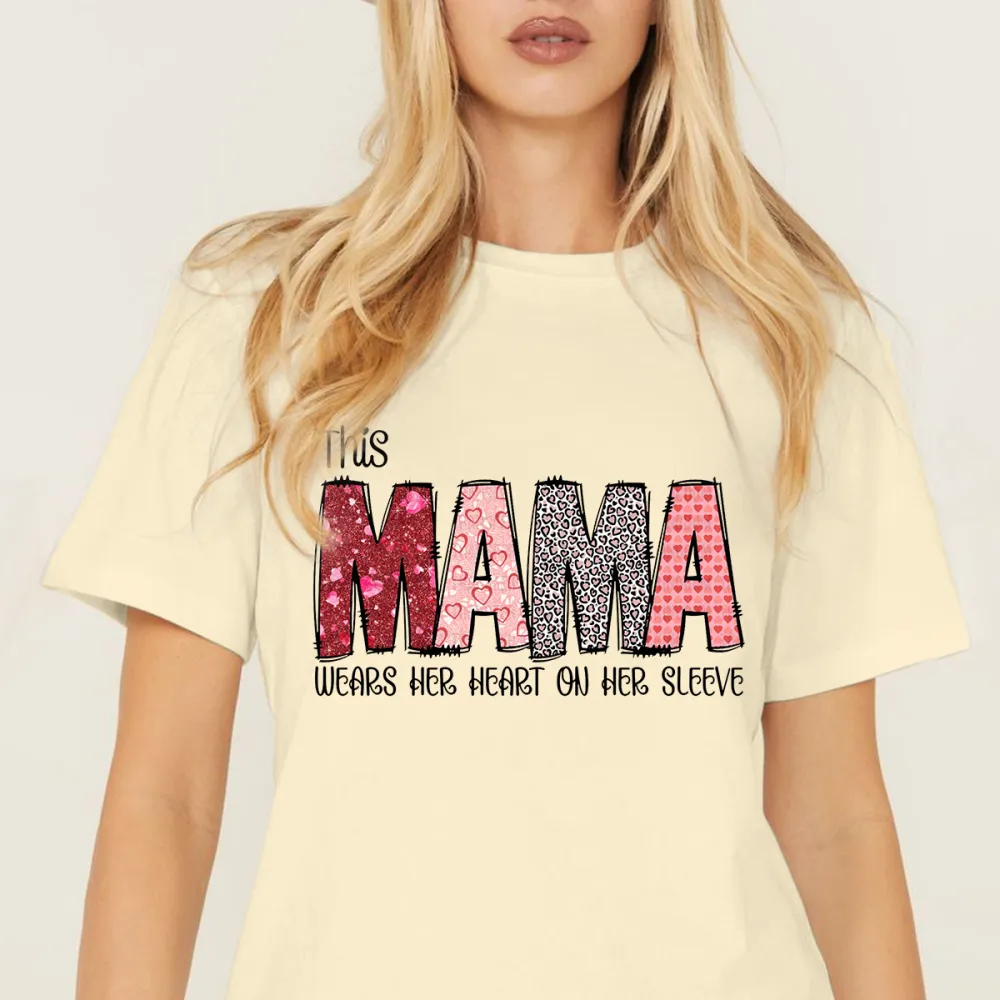 "This Mama Wears Her Heart On Her Sleeve", In Which "Mama" Uses Pink Heart Shape, Red Glitter Effect, Black And White Leopard Print Pattern, Etc., Casual T-Shirt, Mother'S Wear. 2026718