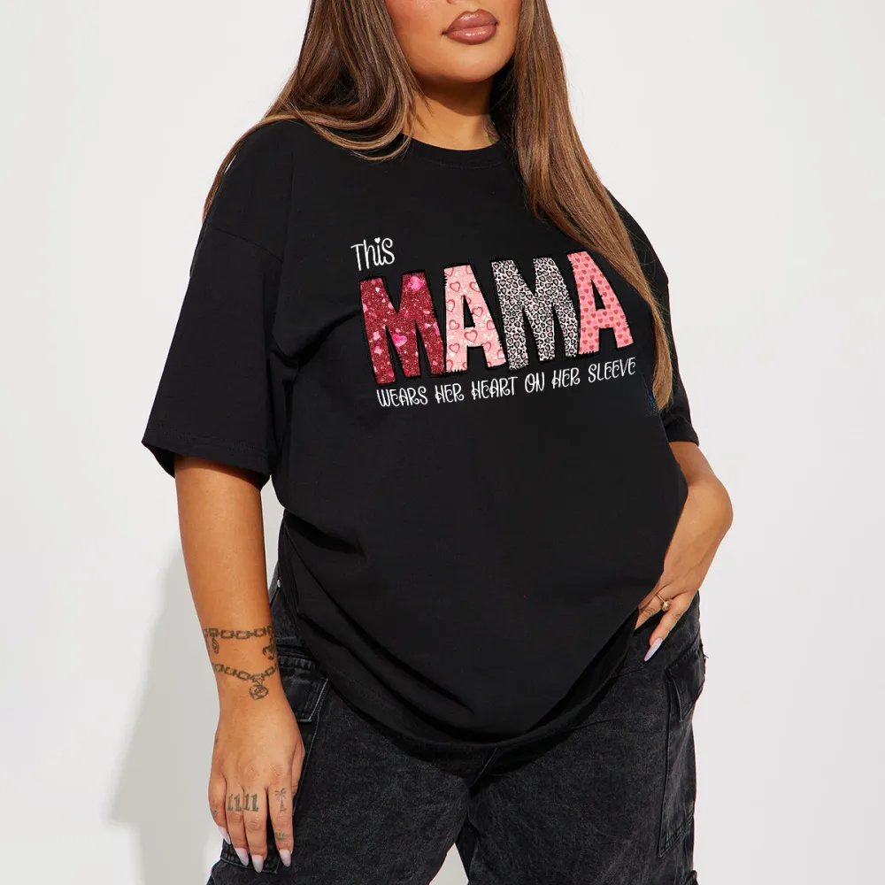 "This Mama Wears Her Heart On Her Sleeve", In Which "Mama" Uses Pink Heart Shape, Red Glitter Effect, Black And White Leopard Print Pattern, Etc., Casual T-Shirt, Mother'S Wear.