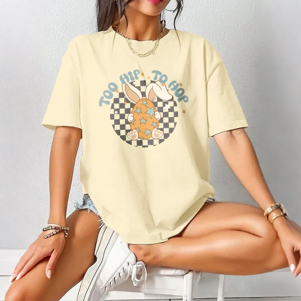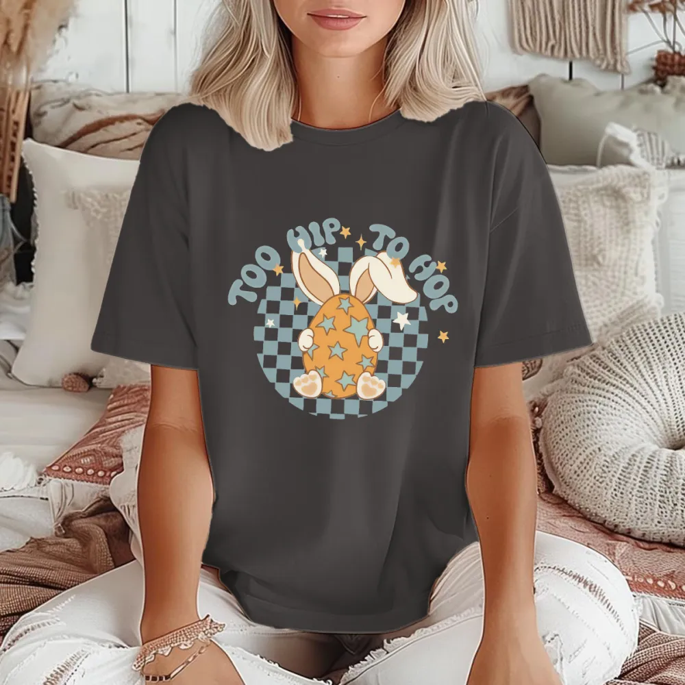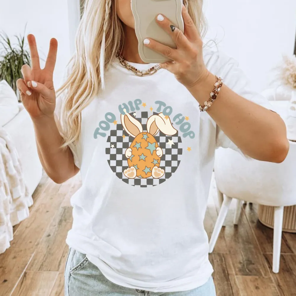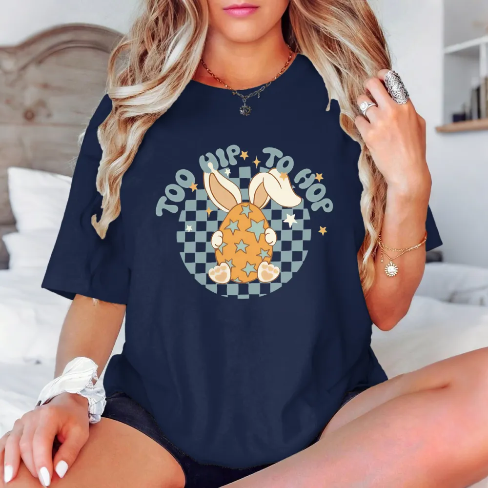 "Too Hip To Hop", Slogan And A Long-Eared Bunny Hidden Behind An Easter Egg With A Star Pattern, A Checkerboard Background, And A Casual T-Shirt.