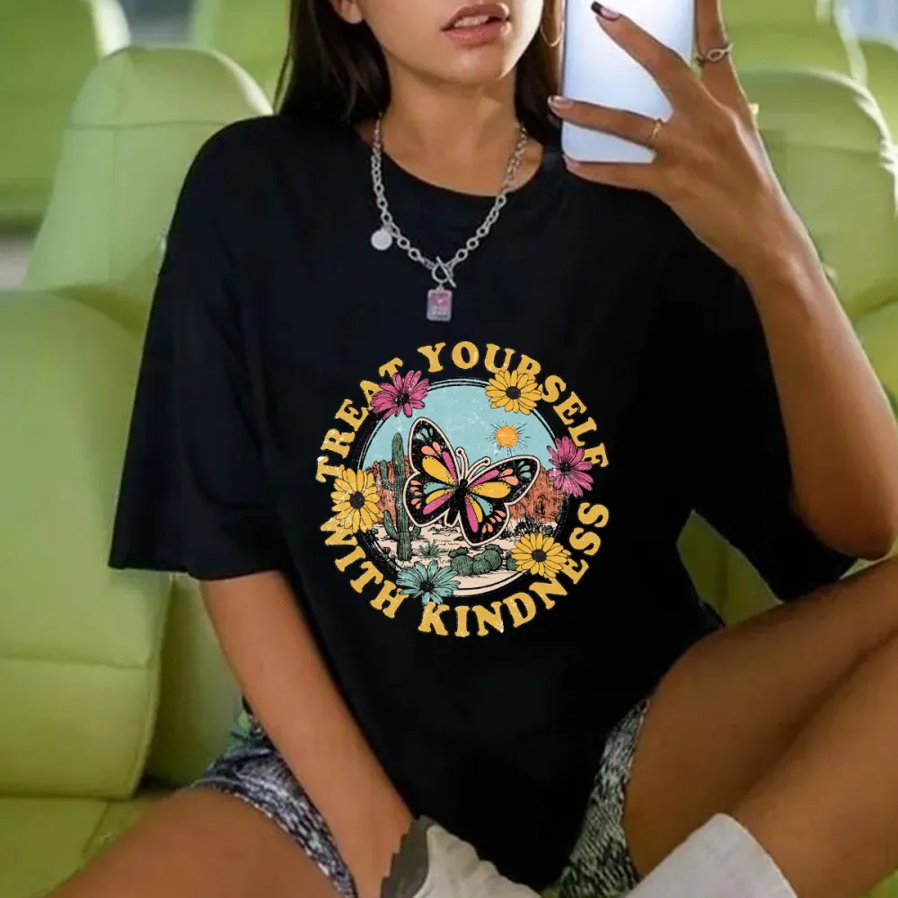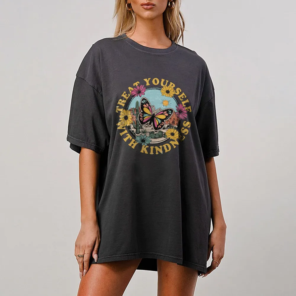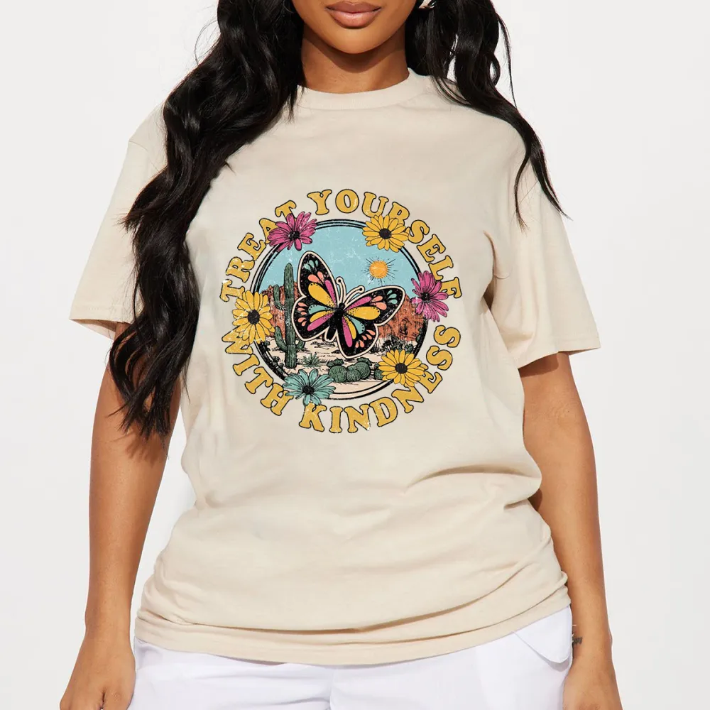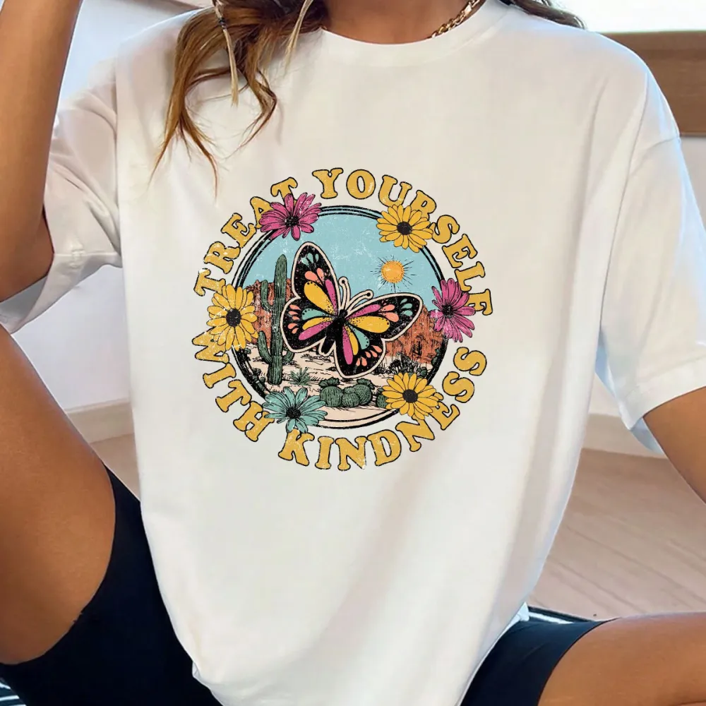 "Treat Yourself With Kindness", The Pattern Includes Elements Such As Butterflies, Cacti, Flowers And The Sun. The Overall Style Is Fresh And Natural, And It Is A Casual And Loose T-Shirt.