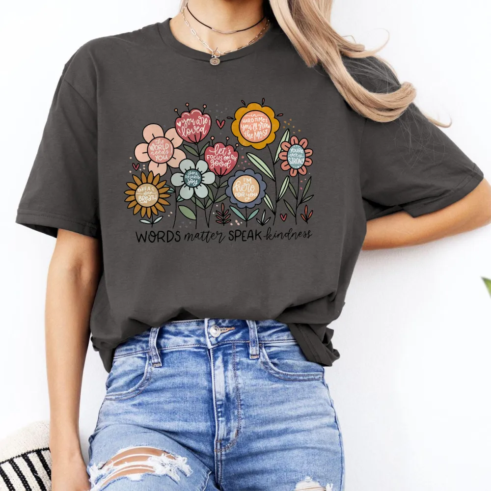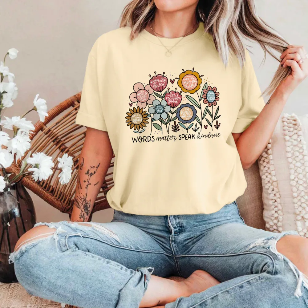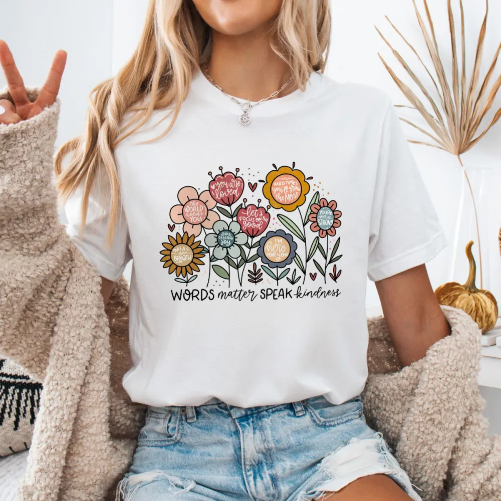 "Words Matter Speak Kindness", Slogan And Floral Pattern In Different Colors, Casual T-Shirt.