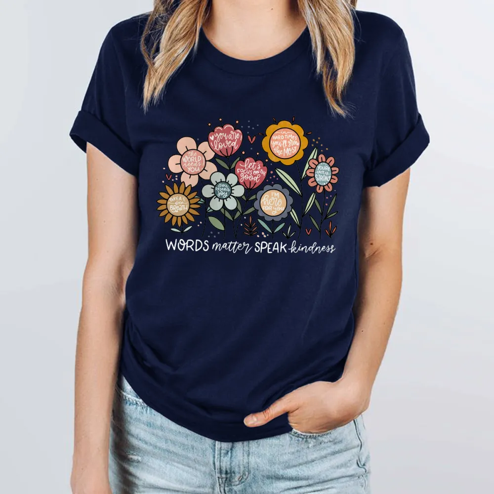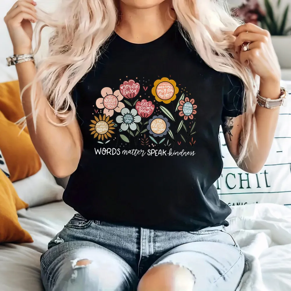 "Words Matter Speak Kindness", Slogan And Floral Pattern In Different Colors, Casual T-Shirt. 2029999