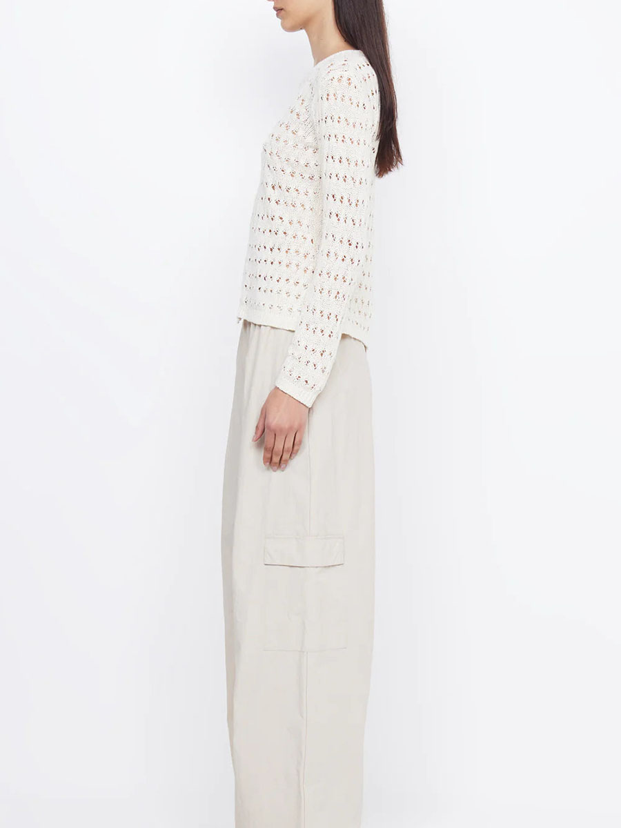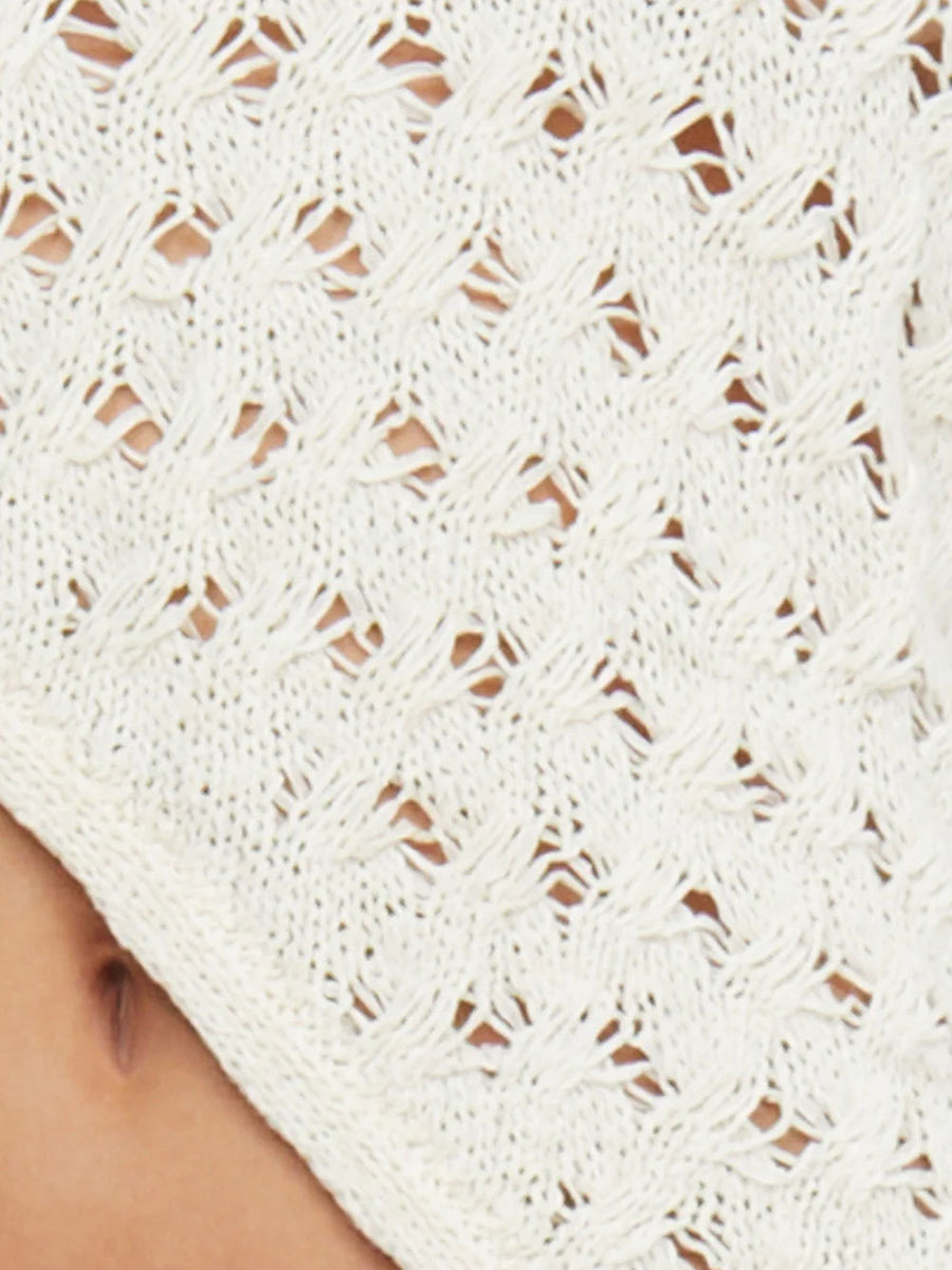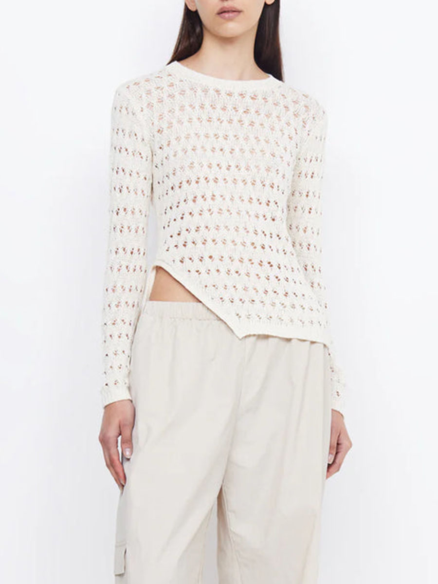 The Long Sleeve Asym Knit Top is crafted from crochet knit in a relaxed silhouette from a cotton blend fabric. Top features a statement asymmetrical hem detail and is finished with ribbing at
