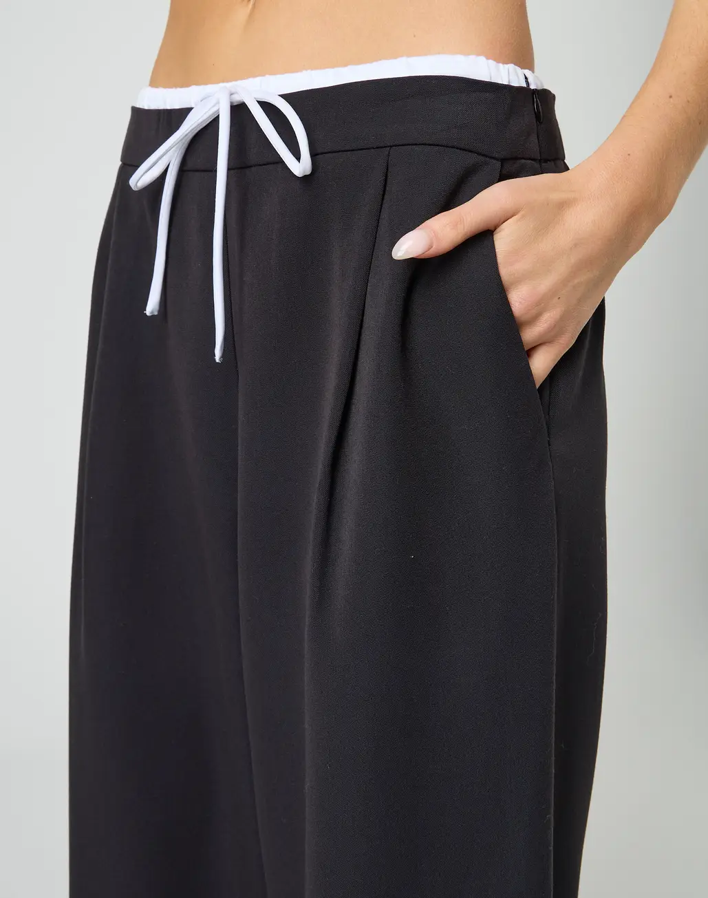 Adding a unique touch to your classic tailored pants, these bottoms feature a double high waistband, drawsting and side zip closure. Front pockets, back false pockets, front darts and a wide leg fit.