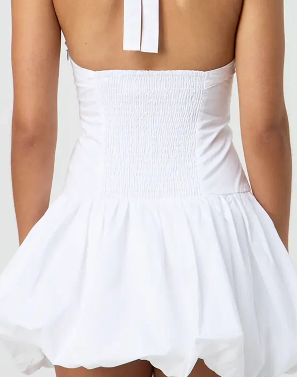 This dress features a button through front, a halter neck, mini length and a bubble hem skirt.