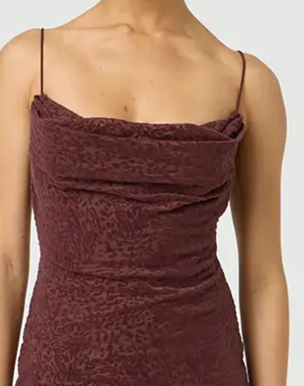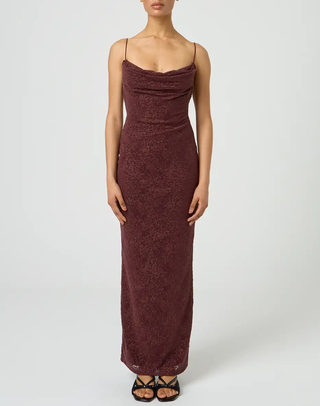 This dress features a cowl neck, an open back with a back clasp closure and a maxi length.