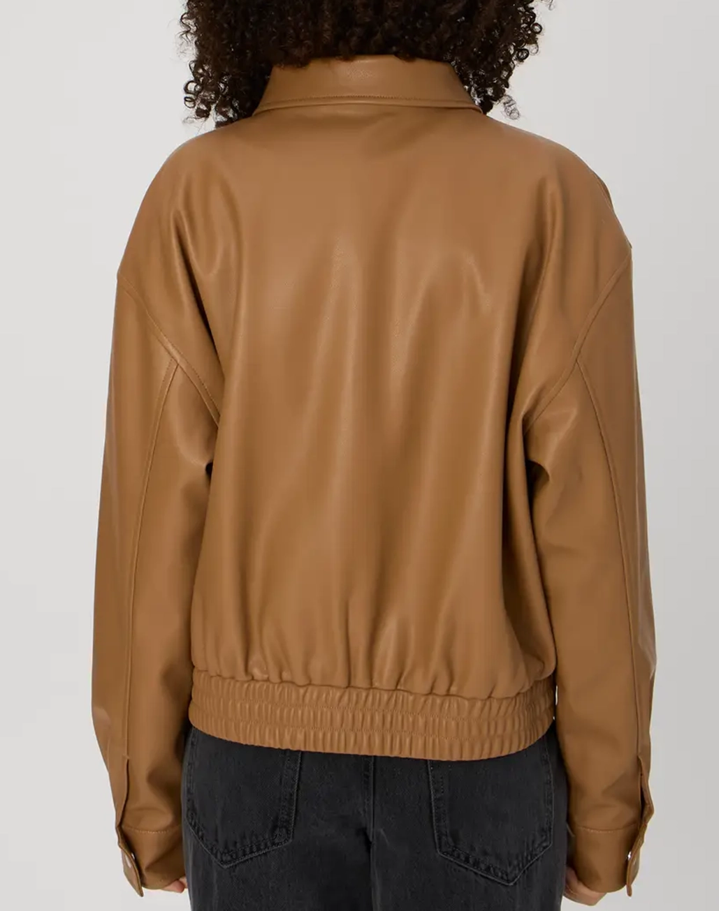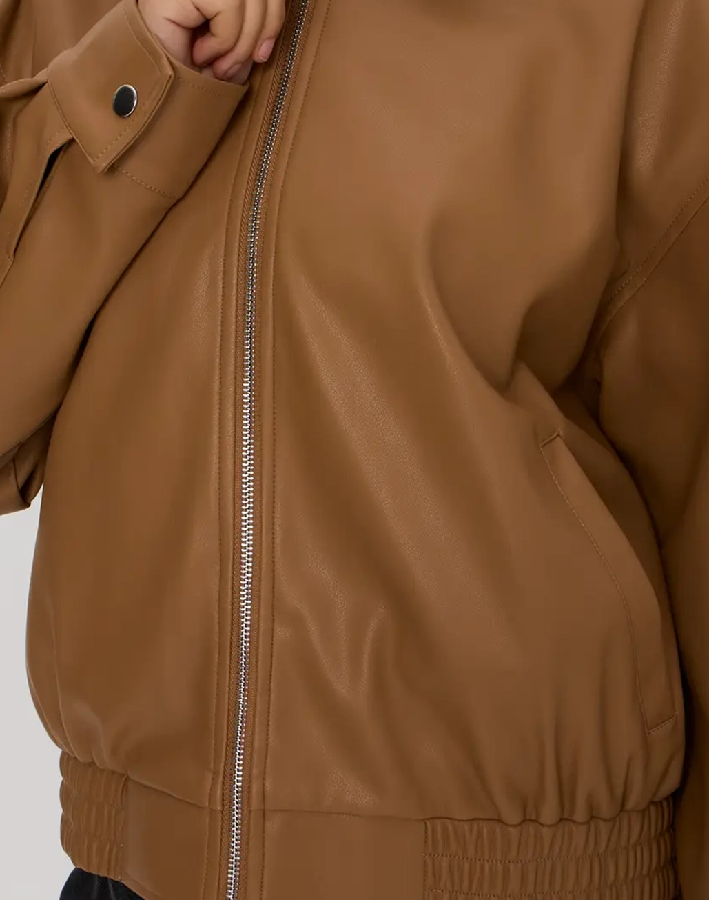 This leather bomber jacket features a drop shoulder, a collar, zip through front and pockets.