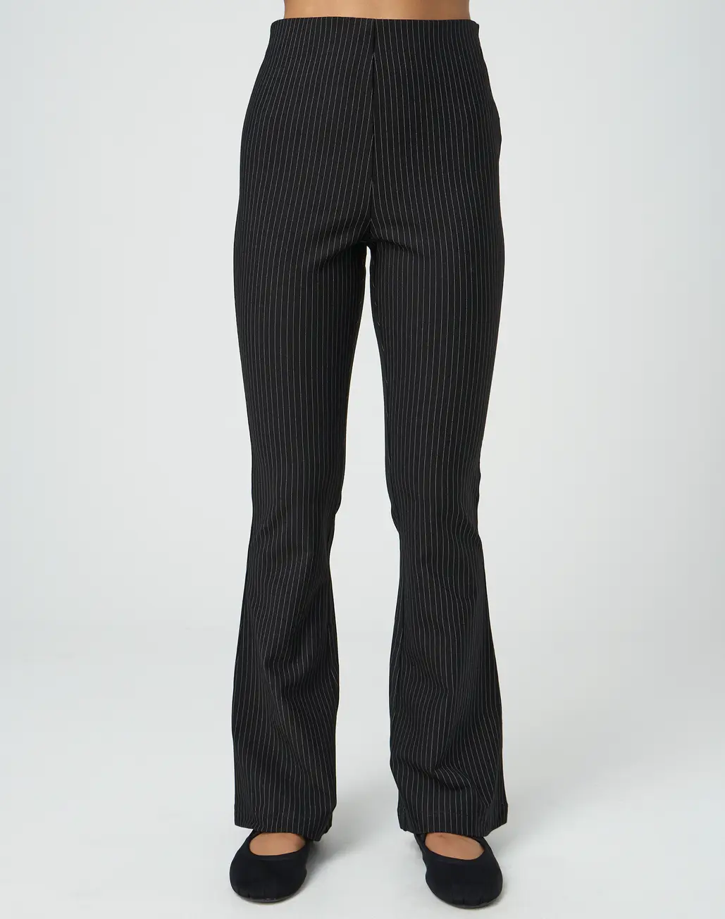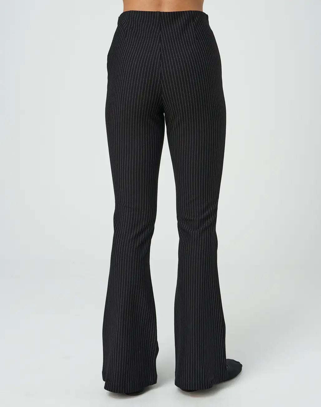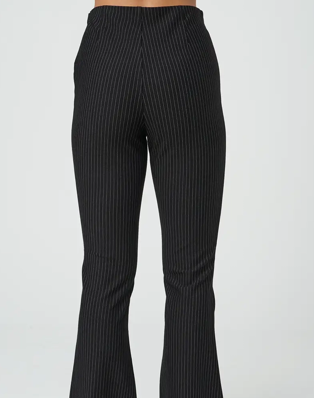 These ponte pants feature a pinstripe pattern, high rise waist and flared legs.